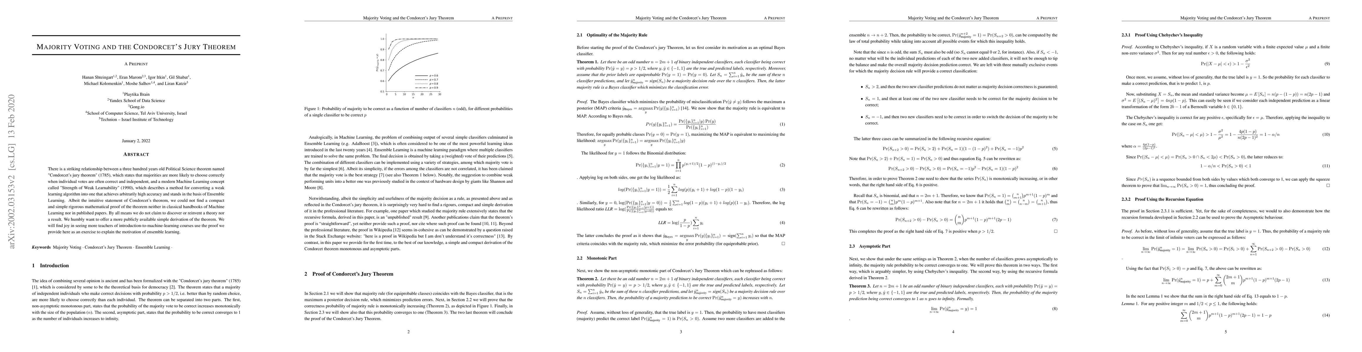 A simple and compact derivation of Condorcet's Jury Theorem, proving its monotonic and asymptotic parts, connecting it to Bayes classification and ensemble learning.