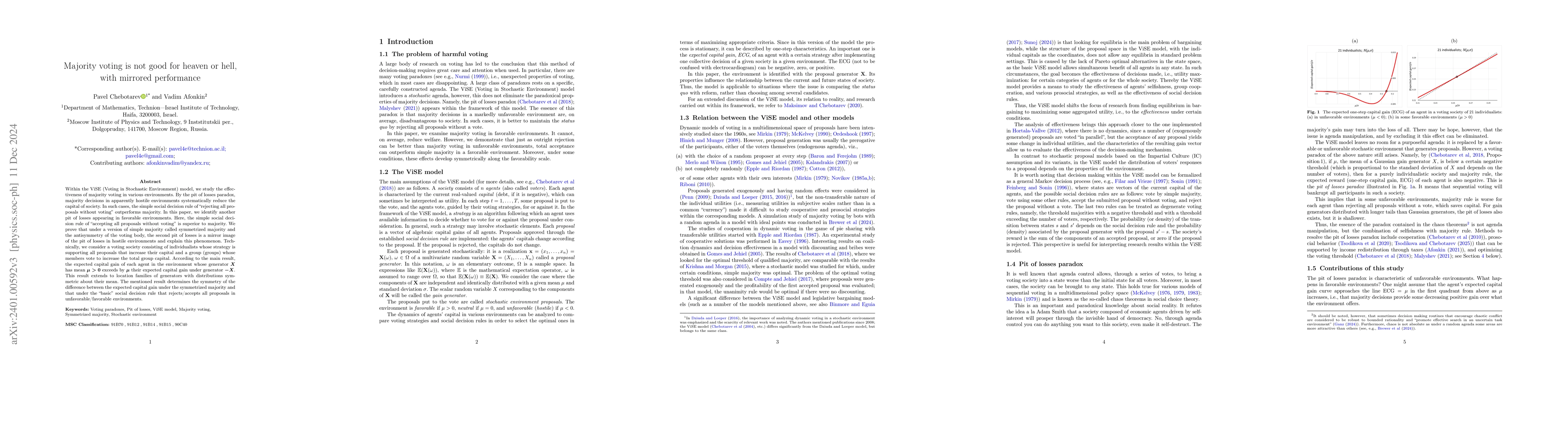 Within the ViSE (Voting in Stochastic Environment) model, we study the effectiveness of majority voting in various environments. By the pit of losses paradox, majority decisions in apparently hostile environments systematically reduce the capital of society. In such cases, the basic action of ``rejecting all proposals without voting'' outperforms simple majority. We reveal another pit of losses appearing in favorable environments. Here, the simple action of ``accepting all proposals without voting'' is superior to simple majority, which thus causes a loss compared to total acceptance. We show that the second pit of losses is a mirror image of the pit of losses in hostile environments and explain this phenomenon. Technically, we consider a voting society consisting of individual agents whose strategy is supporting all proposals that increase their capital and a group whose members vote for the increase of the total group capital. According to the main result, the expected capital gain of each agent in the environment whose proposal generator $\xi$ has mean $\mu>0$ exceeds by $\mu$ their expected capital gain with generator $-\xi$. This result extends to the shift-based families of generators with symmetric distributions. The difference by $\mu$ causes symmetry relative to the basic action that rejects/accepts all proposals in unfavorable/favorable environments.