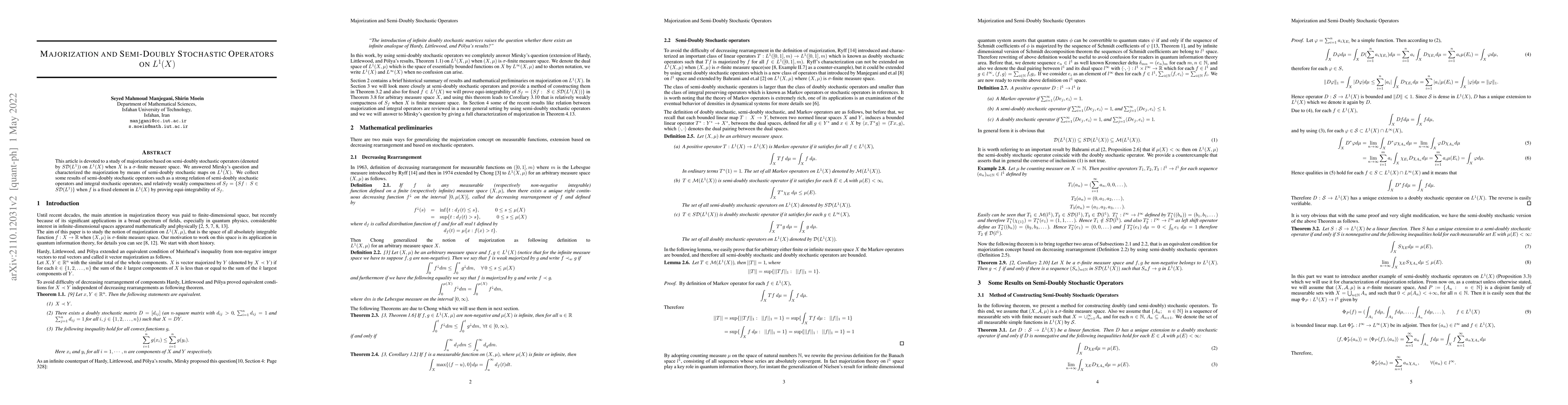 This article is devoted to a study of majorization based on semi-doubly stochastic operators (denoted by $S\mathcal{D}(L^1)$) on $L^1(X)$ when $X$ is a $\sigma$-finite measure space. We answered Mirsky's question and characterized the majorization by means of semi-doubly stochastic maps on $L^1(X)$. We collect some results of semi-doubly stochastic operators such as a strong relation of semi-doubly stochastic operators and integral stochastic operators, and relatively weakly compactness of $S_f=\{Sf: ~S\in S\mathcal{D}(L^1)\}$ when $f$ is a fixed element in $L^1(X)$ by proving equi-integrability of $S_f$.