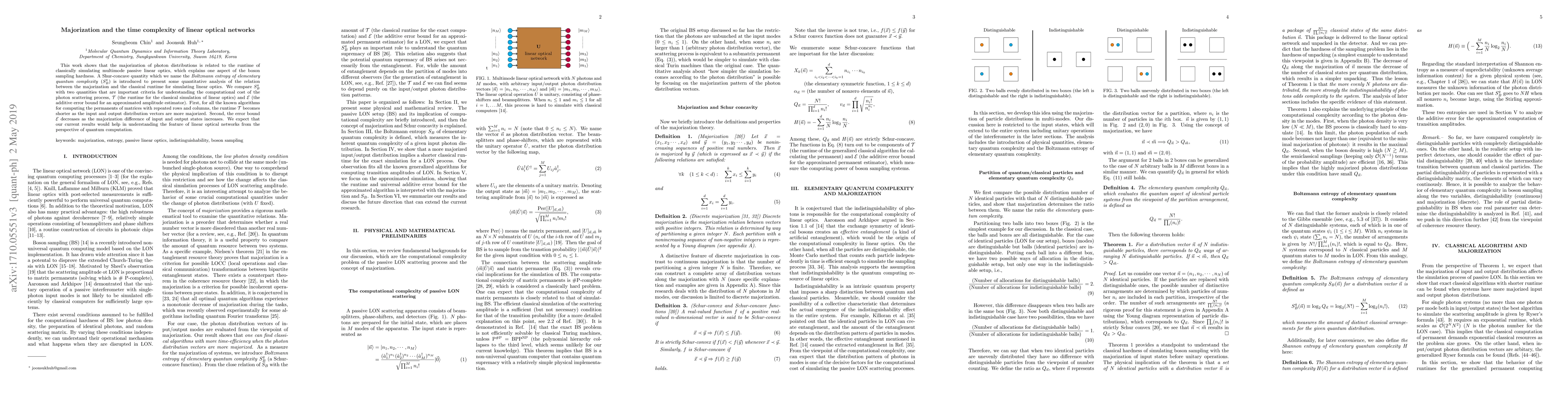 The paper presents a novel connection between majorization theory and classical simulation runtimes of linear optical networks, offering a quantitative analysis using the introduced 'Boltzmann entropy of elementary quantum complexity' ($S_B^q$).