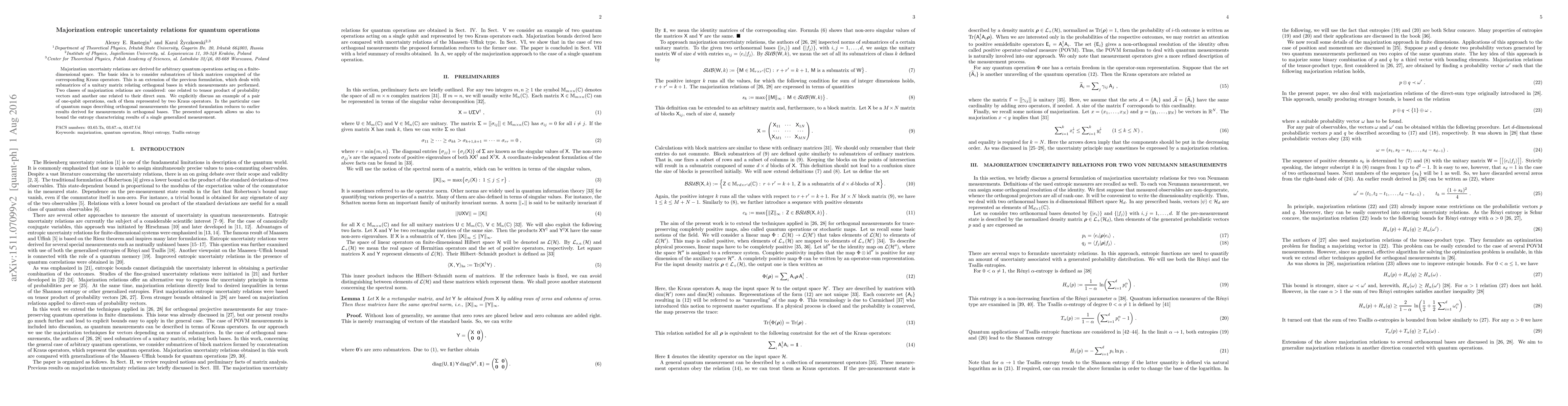 Majorization uncertainty relations are derived for arbitrary quantum operations acting on a finite-dimensional space. The basic idea is to consider submatrices of block matrices comprised of the corresponding Kraus operators. This is an extension of the previous formulation, which deals with submatrices of a unitary matrix relating orthogonal bases in which measurements are performed. Two classes of majorization relations are considered: one related to tensor product of probability vectors and another one related to their direct sum. We explicitly discuss an example of a pair of one-qubit operations, each of them represented by two Kraus operators. In the particular case of quantum maps describing orthogonal measurements the presented formulation reduces to earlier results derived for measurements in orthogonal bases. The presented approach allows us also to bound the entropy characterizing results of a single generalized measurement.