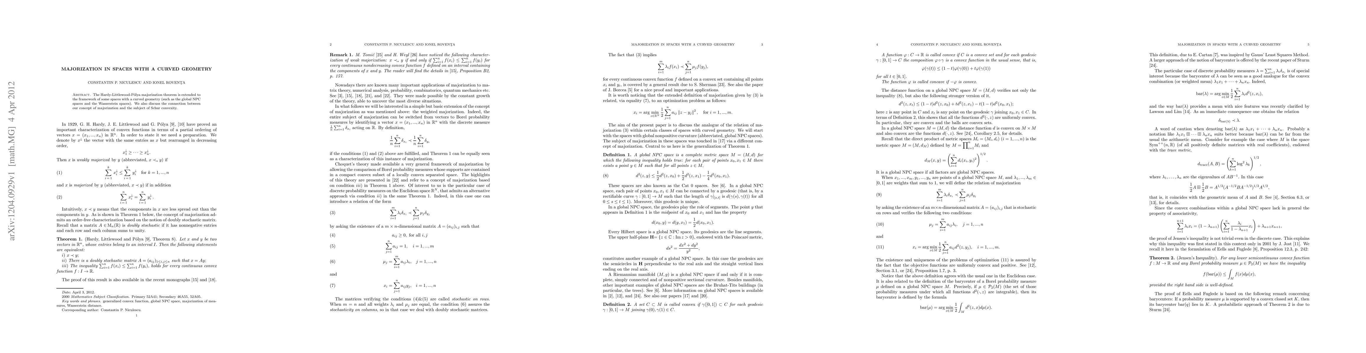 The Hardy-Littlewood-P?olya majorization theorem is extended to the framework of some spaces with a curved geometry (such as the global NPC spaces and the Wasserstein spaces). We also discuss the connection between our concept of majorization and the subject of Schur convexity.