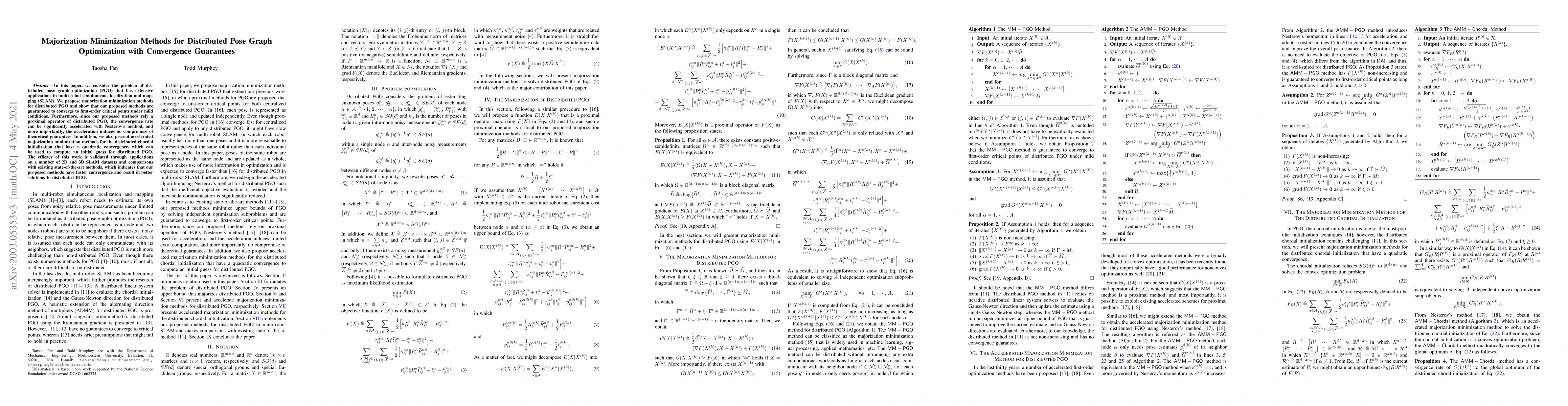 This paper proposes majorization minimization methods for distributed pose graph optimization (PGO) in multi-robot SLAM, ensuring convergence to first-order critical points. The methods also incorporate Nesterov's acceleration without compromising theoretical guarantees, and achieve quadratic convergence for distributed chordal initialization.