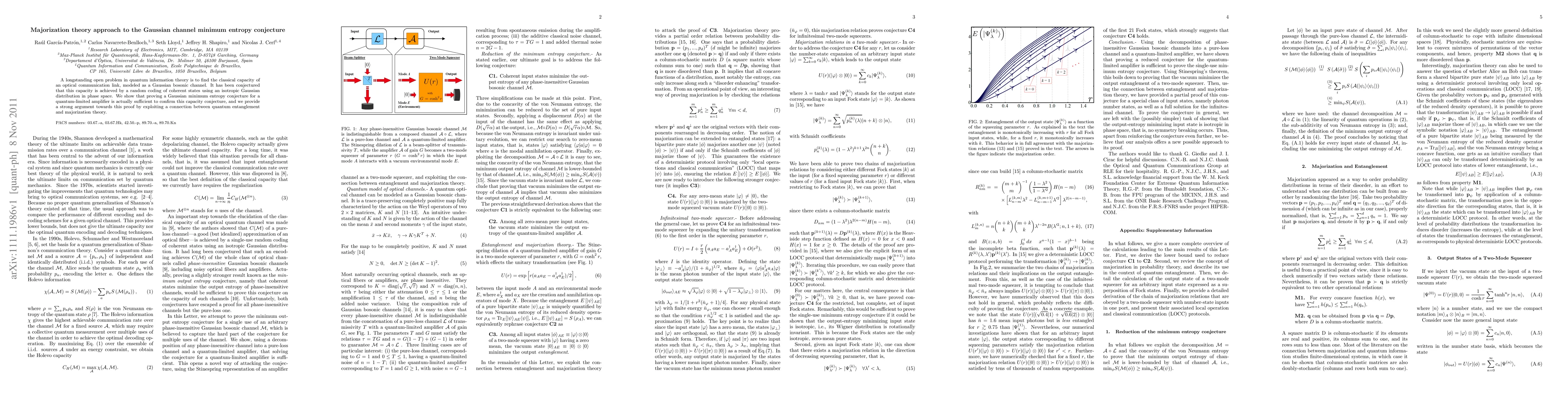 A longstanding open problem in quantum information theory is to find the classical capacity of an optical communication link, modeled as a Gaussian bosonic channel. It has been conjectured that this capacity is achieved by a random coding of coherent states using an isotropic Gaussian distribution in phase space. We show that proving a Gaussian minimum entropy conjecture for a quantum-limited amplifier is actually sufficient to confirm this capacity conjecture, and we provide a strong argument towards this proof by exploiting a connection between quantum entanglement and majorization theory.