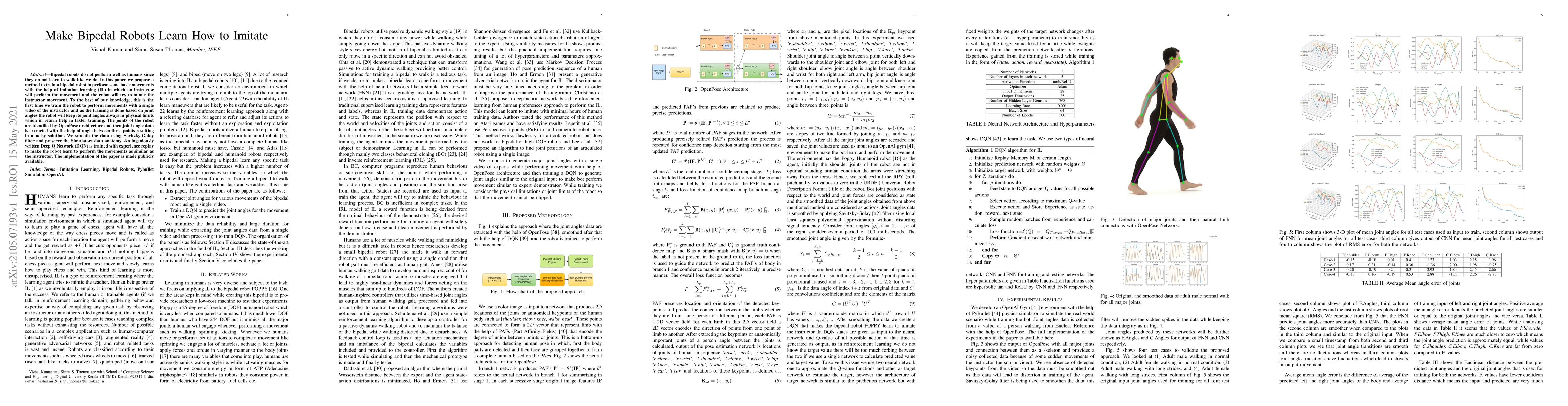 Bipedal robots do not perform well as humans since they do not learn to walk like we do. In this paper we propose a method to train a bipedal robot to perform some basic movements with the help of imitation learning (IL) in which an instructor will perform the movement and the robot will try to mimic the instructor movement. To the best of our knowledge, this is the first time we train the robot to perform movements with a single video of the instructor and as the training is done based on joint angles the robot will keep its joint angles always in physical limits which in return help in faster training. The joints of the robot are identified by OpenPose architecture and then joint angle data is extracted with the help of angle between three points resulting in a noisy solution. We smooth the data using Savitzky-Golay filter and preserve the Simulatore data anatomy. An ingeniously written Deep Q Network (DQN) is trained with experience replay to make the robot learn to perform the movements as similar as the instructor. The implementation of the paper is made publicly available.