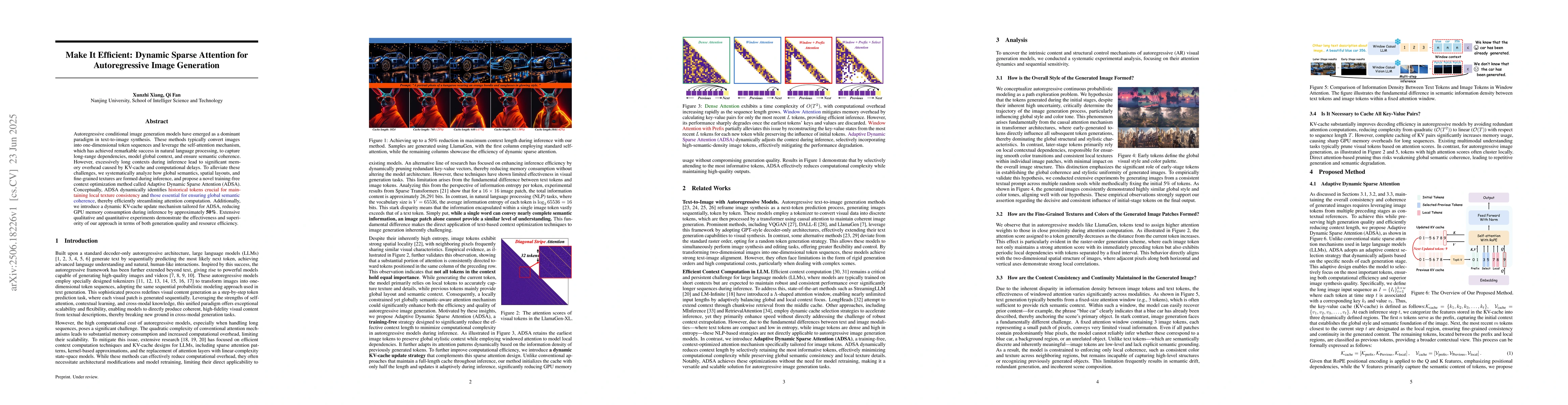 Autoregressive conditional image generation models have emerged as a dominant paradigm in text-to-image synthesis. These methods typically convert images into one-dimensional token sequences and leverage the self-attention mechanism, which has achieved remarkable success in natural language processing, to capture long-range dependencies, model global context, and ensure semantic coherence. However, excessively long contexts during inference lead to significant memory overhead caused by KV-cache and computational delays. To alleviate these challenges, we systematically analyze how global semantics, spatial layouts, and fine-grained textures are formed during inference, and propose a novel training-free context optimization method called Adaptive Dynamic Sparse Attention (ADSA). Conceptually, ADSA dynamically identifies historical tokens crucial for maintaining local texture consistency and those essential for ensuring global semantic coherence, thereby efficiently streamlining attention computation. Additionally, we introduce a dynamic KV-cache update mechanism tailored for ADSA, reducing GPU memory consumption during inference by approximately $50\%$. Extensive qualitative and quantitative experiments demonstrate the effectiveness and superiority of our approach in terms of both generation quality and resource efficiency.