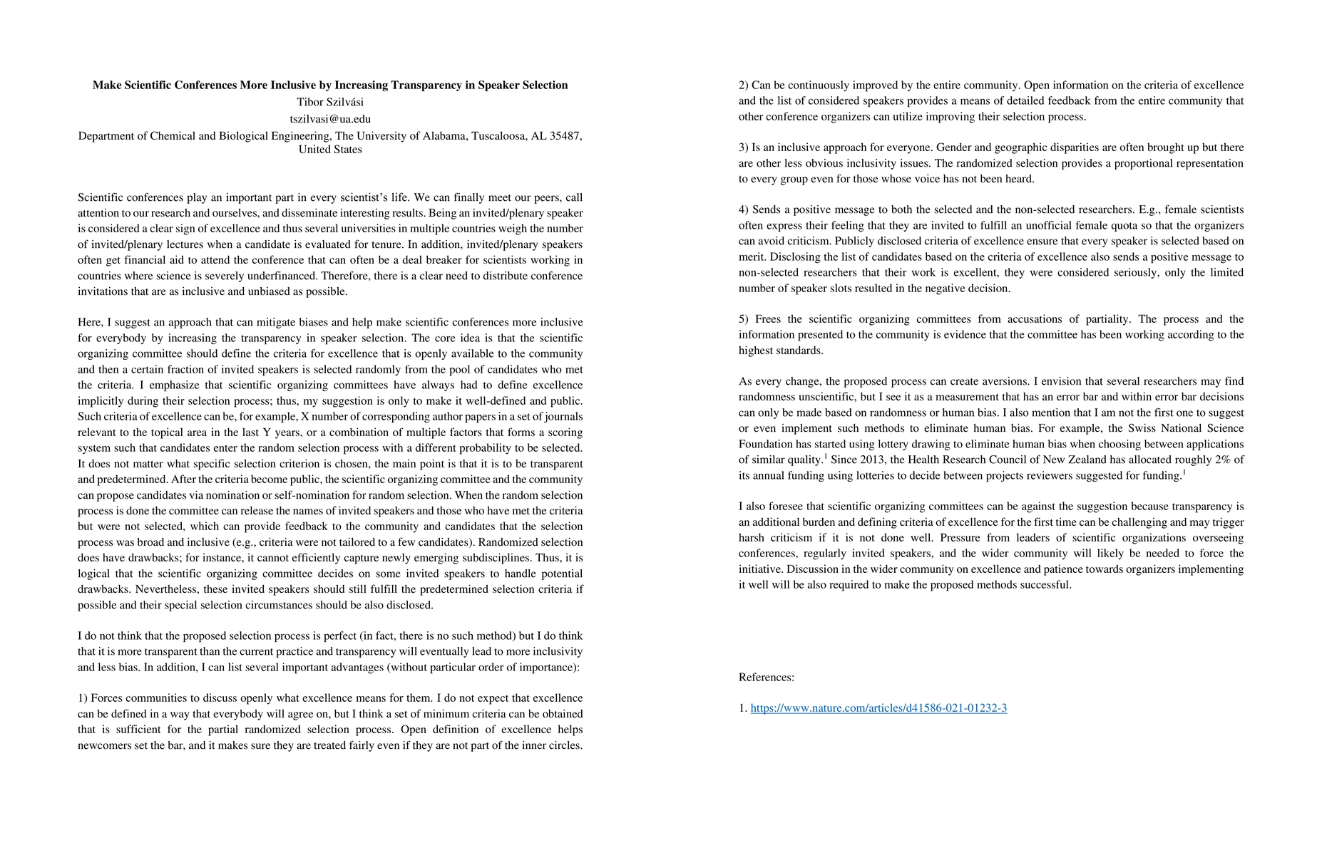 Summary: This paper proposes a method to enhance inclusivity at scientific conferences by promoting transparency in speaker selection, aiming to reduce biases and ensure a more equitable environment for all participants. The approach emphasizes clear criteria and open processes for choosing speakers.
