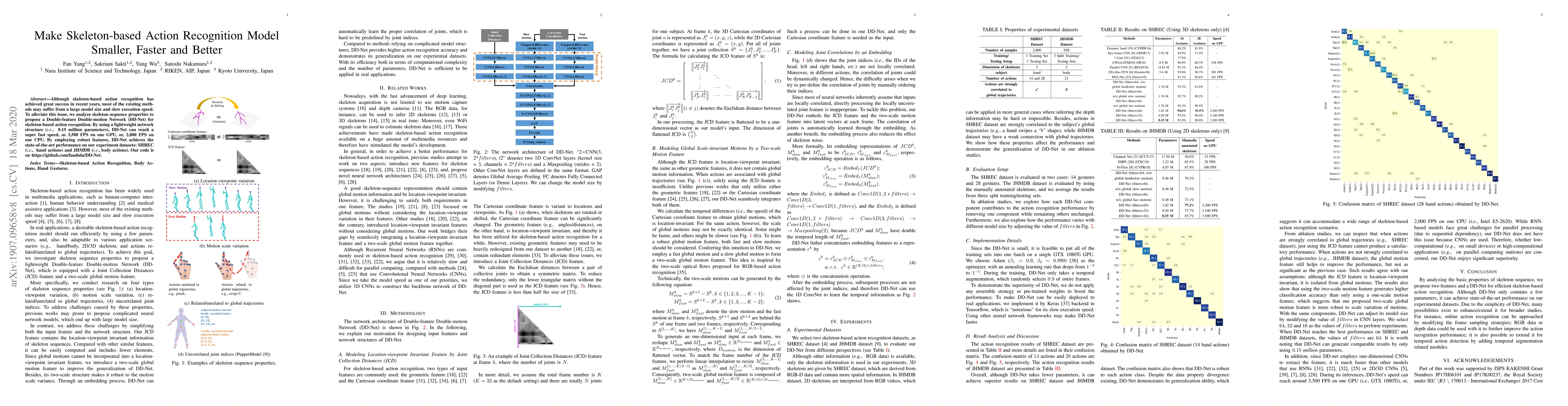 A new model called DD-Net improves skeleton-based action recognition with a lightweight network that achieves state-of-the-art performance while running at 3,500 FPS on one GPU.
