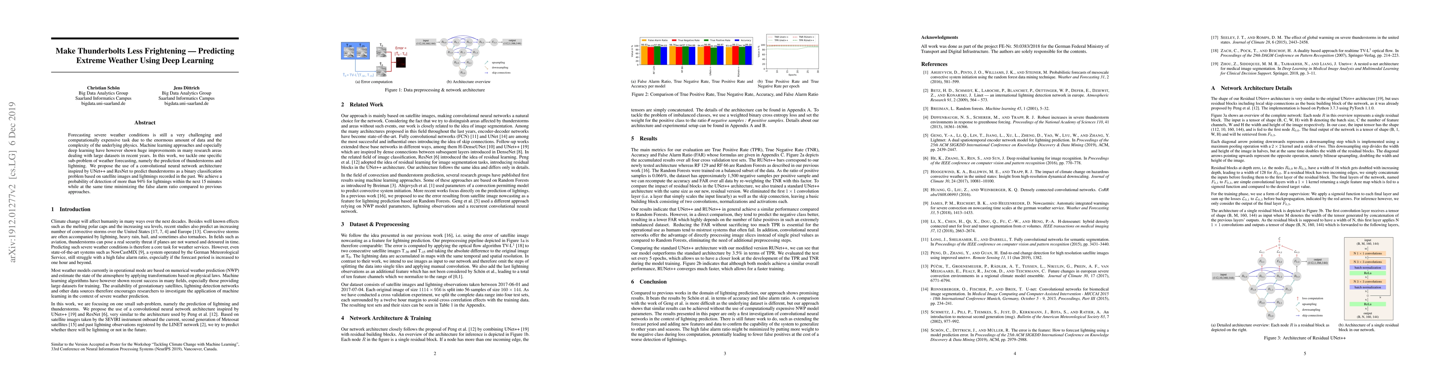 Forecasting severe weather conditions is still a very challenging and computationally expensive task due to the enormous amount of data and the complexity of the underlying physics. Machine learning approaches and especially deep learning have however shown huge improvements in many research areas dealing with large datasets in recent years. In this work, we tackle one specific sub-problem of weather forecasting, namely the prediction of thunderstorms and lightning. We propose the use of a convolutional neural network architecture inspired by UNet++ and ResNet to predict thunderstorms as a binary classification problem based on satellite images and lightnings recorded in the past. We achieve a probability of detection of more than 94% for lightnings within the next 15 minutes while at the same time minimizing the false alarm ratio compared to previous approaches.