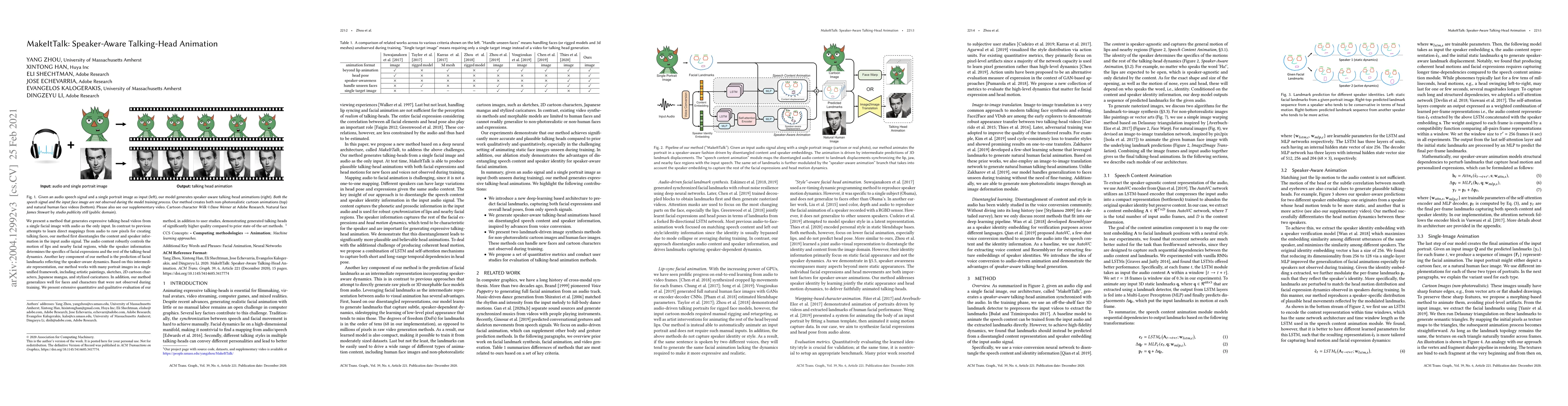 We present a method that generates expressive talking heads from a single facial image with audio as the only input. In contrast to previous approaches that attempt to learn direct mappings from audio to raw pixels or points for creating talking faces, our method first disentangles the content and speaker information in the input audio signal. The audio content robustly controls the motion of lips and nearby facial regions, while the speaker information determines the specifics of facial expressions and the rest of the talking head dynamics. Another key component of our method is the prediction of facial landmarks reflecting speaker-aware dynamics. Based on this intermediate representation, our method is able to synthesize photorealistic videos of entire talking heads with full range of motion and also animate artistic paintings, sketches, 2D cartoon characters, Japanese mangas, stylized caricatures in a single unified framework. We present extensive quantitative and qualitative evaluation of our method, in addition to user studies, demonstrating generated talking heads of significantly higher quality compared to prior state-of-the-art.