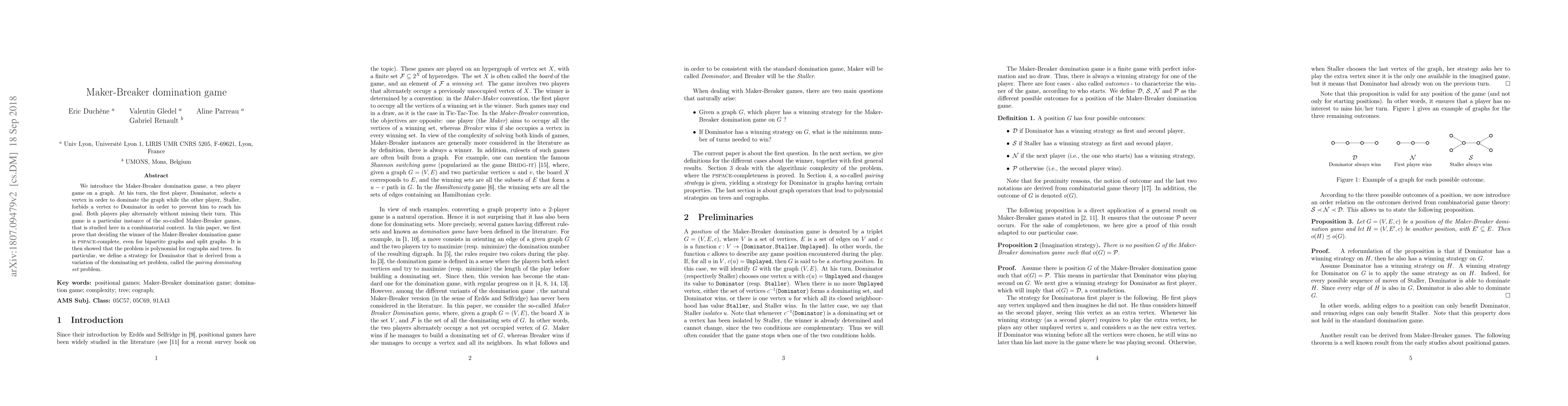 This research contributes to the understanding of the complexity of the Maker-Breaker domination game on graphs.