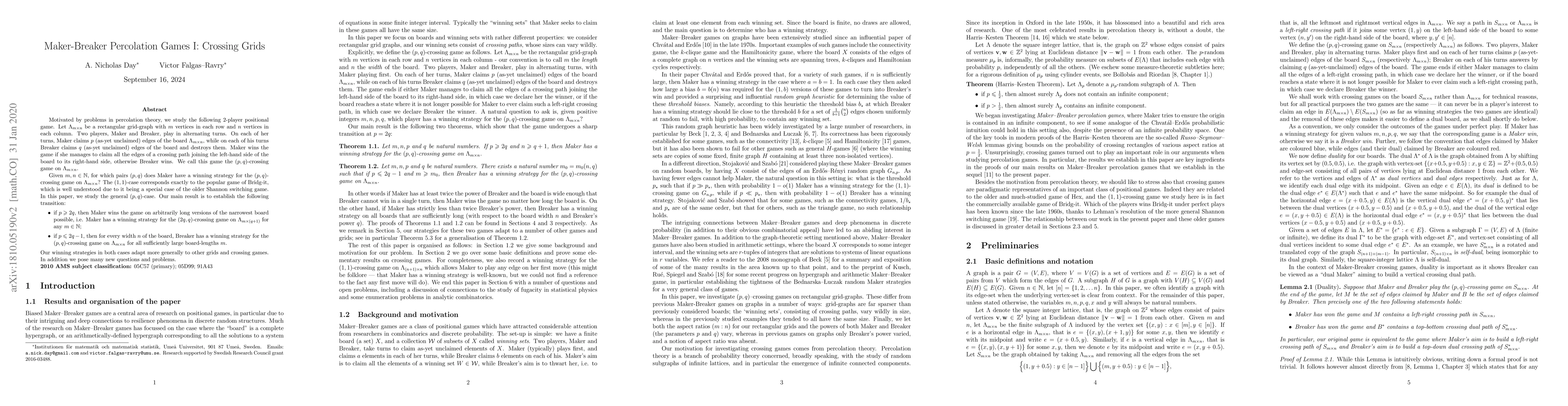 Motivated by problems in percolation theory, we study the following 2-player positional game. Let $\Lambda_{m \times n}$ be a rectangular grid-graph with $m$ vertices in each row and $n$ vertices in each column. Two players, Maker and Breaker, play in alternating turns. On each of her turns, Maker claims $p$ (as-yet unclaimed) edges of the board $\Lambda_{m \times n}$, while on each of his turns Breaker claims $q$ (as-yet unclaimed) edges of the board and destroys them. Maker wins the game if she manages to claim all the edges of a crossing path joining the left-hand side of the board to its right-hand side, otherwise Breaker wins. We call this game the $(p,q)$-crossing game on $\Lambda_{m \times n}$. Given $m,n\in \mathbb{N}$, for which pairs $(p,q)$ does Maker have a winning strategy for the $(p,q)$-crossing game on $\Lambda_{m \times n}$? The $(1,1)$-case corresponds exactly to the popular game of Bridg-it, which is well understood due to it being a special case of the older Shannon switching game. In this paper, we study the general $(p,q)$-case. Our main result is to establish the following transition: $\bullet$ If $p\geqslant 2q$, then Maker wins the game on arbitrarily long versions of the narrowest board possible, i.e. Maker has a winning strategy for the $(2q, q)$-crossing game on $\Lambda_{m \times(q+1)}$ for any $m\in \mathbb{N}$; $\bullet$ if $p\leqslant 2q-1$, then for every width $n$ of the board, Breaker has a winning strategy for the $(p,q)$-crossing game on $\Lambda_{m \times n}$ for all sufficiently large board-lengths $m$. Our winning strategies in both cases adapt more generally to other grids and crossing games. In addition we pose many new questions and problems.
