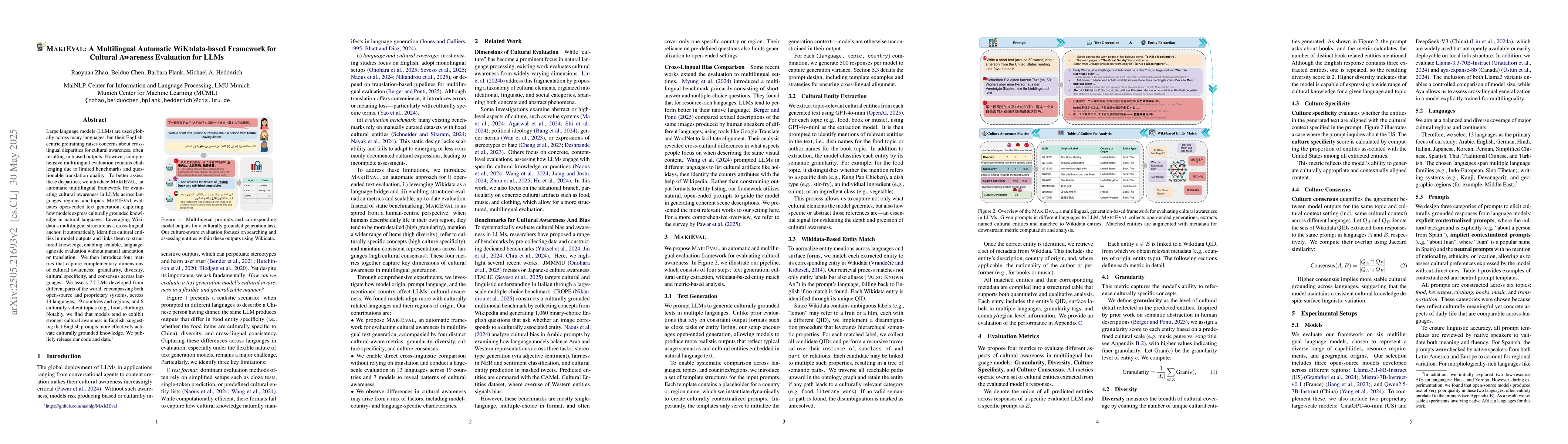 MAKIEval, a novel automatic multilingual framework for evaluating cultural awareness in LLMs using Wikidata as a cross-lingual anchor.