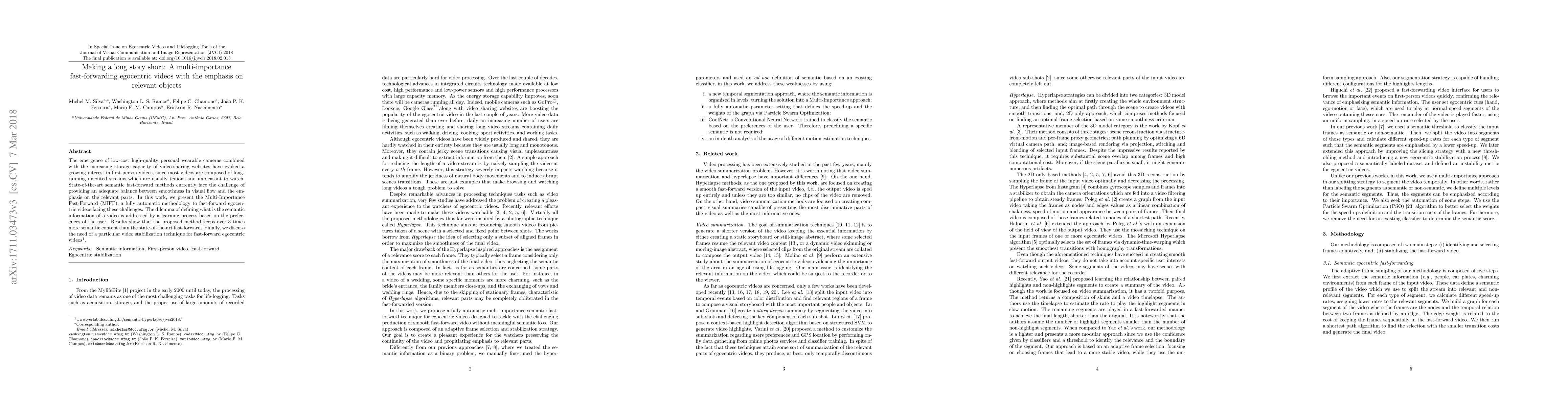 This paper introduces Multi-Importance Fast-Forward (MIFF) to automatically condense long egocentric videos, focusing on relevant objects and user preferences. The method outperforms existing techniques by retaining over three times more semantic content while discussing the necessity of video stabilization for smooth playback.