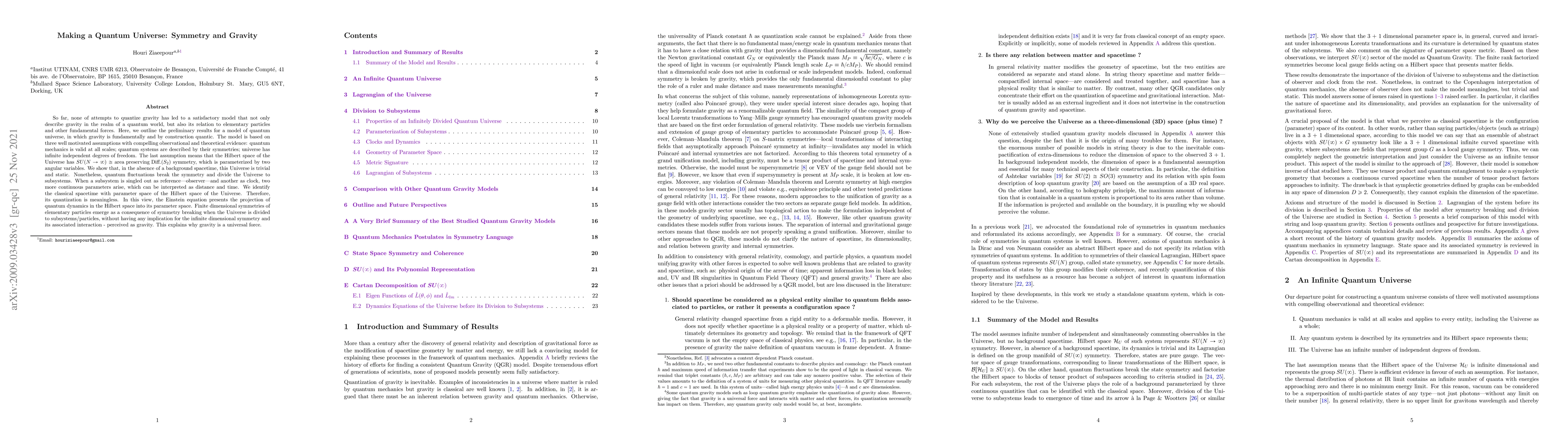 So far, none of attempts to quantize gravity has led to a satisfactory model that not only describe gravity in the realm of a quantum world, but also its relation to elementary particles and other fundamental forces. Here, we outline the preliminary results for a model of quantum universe, in which gravity is fundamentally and by construction quantic. The model is based on three well motivated assumptions with compelling observational and theoretical evidence: quantum mechanics is valid at all scales; quantum systems are described by their symmetries; universe has infinite independent degrees of freedom. The last assumption means that the Hilbert space of the Universe has $SU(N\rightarrow \infty) \cong \text{area preserving Diff.} (S_2)$ symmetry, which is parameterized by two angular variables. We show that, in the absence of a background spacetime, this Universe is trivial and static. Nonetheless, quantum fluctuations break the symmetry and divide the Universe to subsystems. When a subsystem is singled out as reference -- observer -- and another as clock, two more continuous parameters arise, which can be interpreted as distance and time. We identify the classical spacetime with parameter space of the Hilbert space of the Universe. Therefore, its quantization is meaningless. In this view, the Einstein equation presents the projection of quantum dynamics in the Hilbert space into its parameter space. Finite dimensional symmetries of elementary particles emerge as a consequence of symmetry breaking when the Universe is divided to subsystems/particles, without having any implication for the infinite dimensional symmetry and its associated interaction - perceived as gravity. This explains why gravity is a universal force.