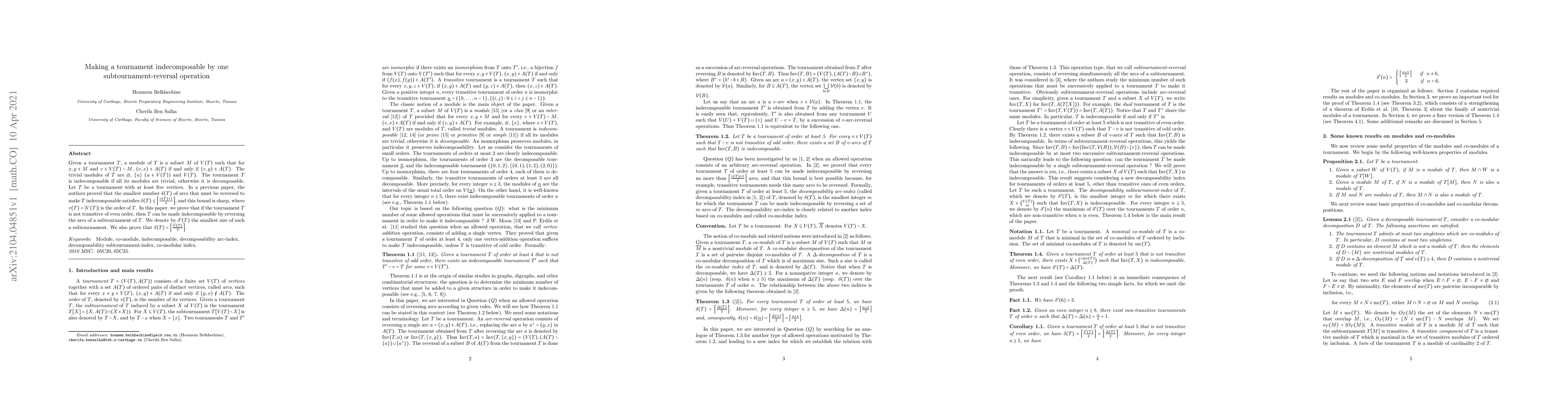 Given a tournament $T$, a module of $T$ is a subset $M$ of $V(T)$ such that for $x, y\in M$ and $v\in V(T)\setminus M$, $(v,x)\in A(T)$ if and only if $(v,y)\in A(T)$. The trivial modules of $T$ are $\emptyset$, $\{u\}$ $(u\in V(T))$ and $V(T)$. The tournament $T$ is indecomposable if all its modules are trivial; otherwise it is decomposable. Let $T$ be a tournament with at least five vertices. In a previous paper, the authors proved that the smallest number $\delta(T)$ of arcs that must be reversed to make $T$ indecomposable satisfies $\delta(T) \leq \left\lceil \frac{v(T)+1}{4} \right\rceil$, and this bound is sharp, where $v(T) = |V(T)|$ is the order of $T$. In this paper, we prove that if the tournament $T$ is not transitive of even order, then $T$ can be made indecomposable by reversing the arcs of a subtournament of $T$. We denote by $\delta'(T)$ the smallest size of such a subtournament. We also prove that $\delta(T) = \left\lceil \frac{\delta'(T)}{2} \right\rceil$.