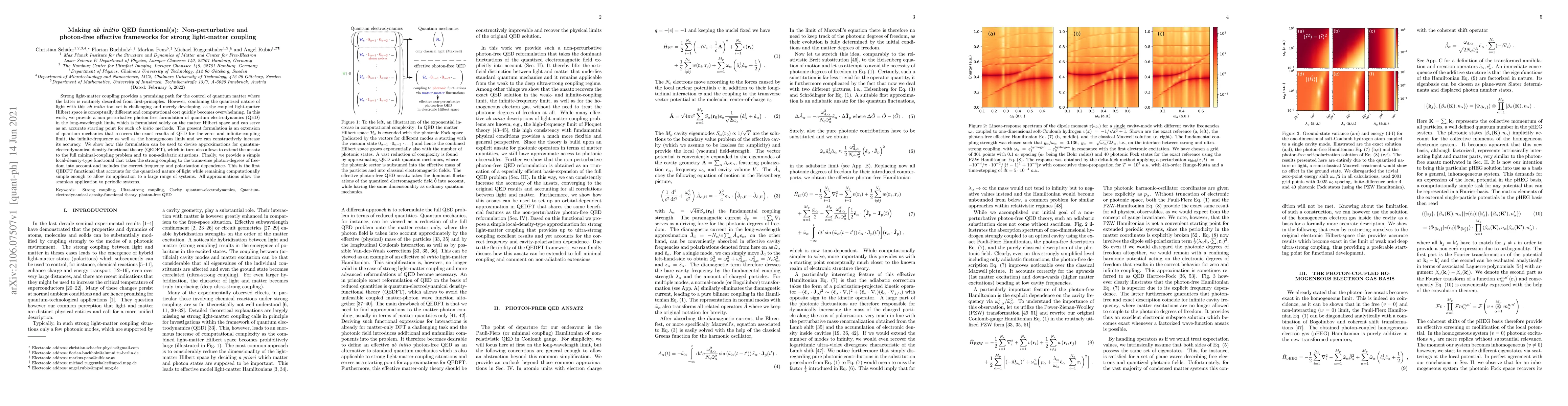 This paper introduces a non-perturbative photon-free formulation of quantum electrodynamics (QED) for strong light-matter coupling, providing an effective framework that can be used in ab initio methods. The new formulation extends quantum mechanics to accurately describe QED in various limits and enables the development of approximations for quantum-electrodynamical density-functional theory (QEDFT), facilitating the study of non-adiabatic systems and periodic materials.