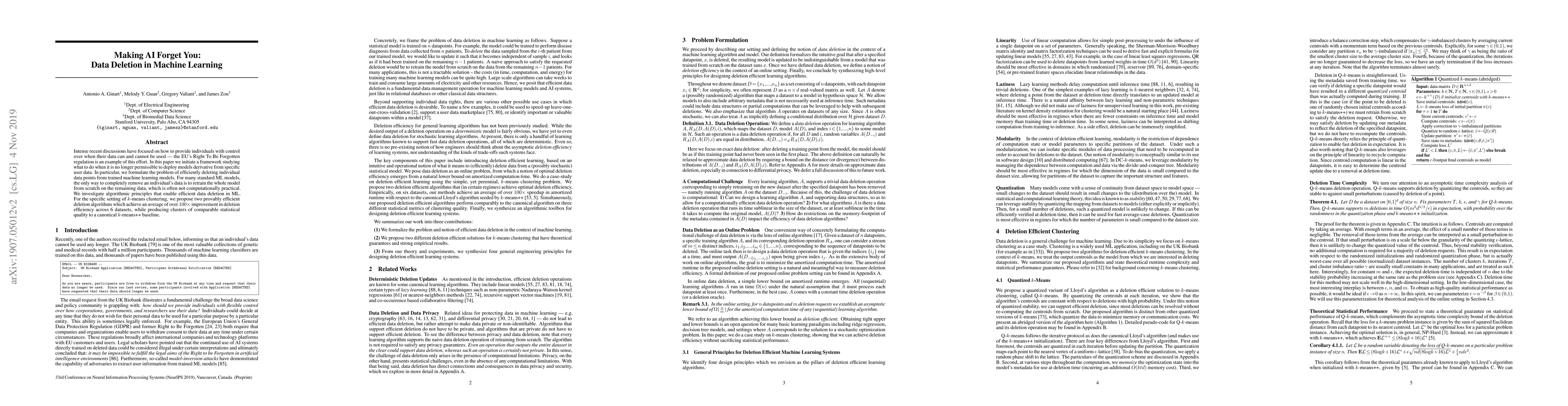 Intense recent discussions have focused on how to provide individuals with control over when their data can and cannot be used --- the EU's Right To Be Forgotten regulation is an example of this effort. In this paper we initiate a framework studying what to do when it is no longer permissible to deploy models derivative from specific user data. In particular, we formulate the problem of efficiently deleting individual data points from trained machine learning models. For many standard ML models, the only way to completely remove an individual's data is to retrain the whole model from scratch on the remaining data, which is often not computationally practical. We investigate algorithmic principles that enable efficient data deletion in ML. For the specific setting of k-means clustering, we propose two provably efficient deletion algorithms which achieve an average of over 100X improvement in deletion efficiency across 6 datasets, while producing clusters of comparable statistical quality to a canonical k-means++ baseline.