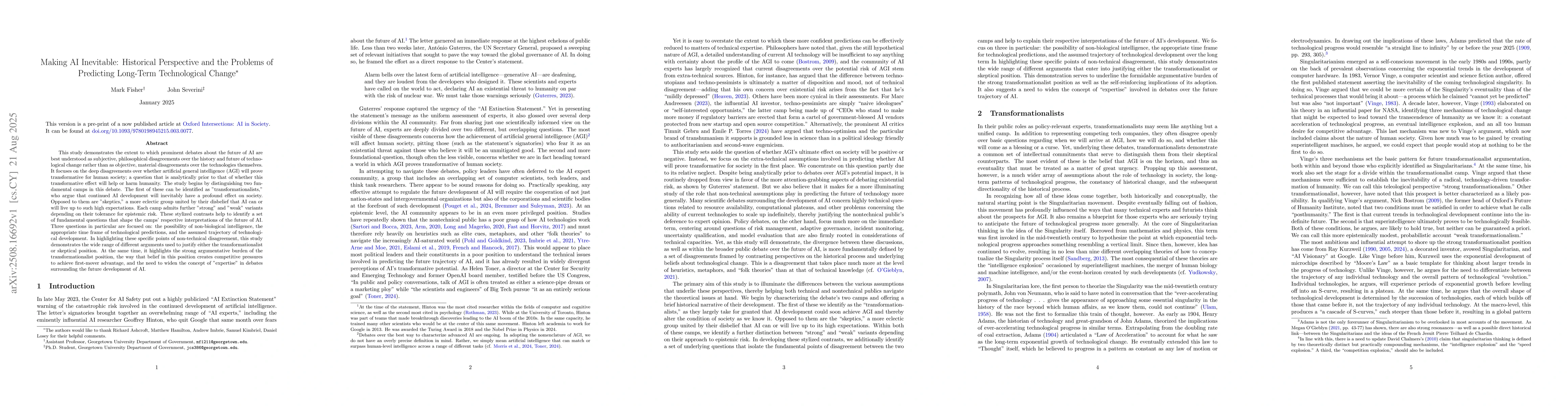 This study demonstrates the extent to which prominent debates about the future of AI are best understood as subjective, philosophical disagreements over the history and future of technological change rather than as objective, material disagreements over the technologies themselves. It focuses on the deep disagreements over whether artificial general intelligence (AGI) will prove transformative for human society; a question that is analytically prior to that of whether this transformative effect will help or harm humanity. The study begins by distinguishing two fundamental camps in this debate. The first of these can be identified as "transformationalists," who argue that continued AI development will inevitably have a profound effect on society. Opposed to them are "skeptics," a more eclectic group united by their disbelief that AI can or will live up to such high expectations. Each camp admits further "strong" and "weak" variants depending on their tolerance for epistemic risk. These stylized contrasts help to identify a set of fundamental questions that shape the camps' respective interpretations of the future of AI. Three questions in particular are focused on: the possibility of non-biological intelligence, the appropriate time frame of technological predictions, and the assumed trajectory of technological development. In highlighting these specific points of non-technical disagreement, this study demonstrates the wide range of different arguments used to justify either the transformationalist or skeptical position. At the same time, it highlights the strong argumentative burden of the transformationalist position, the way that belief in this position creates competitive pressures to achieve first-mover advantage, and the need to widen the concept of "expertise" in debates surrounding the future development of AI.