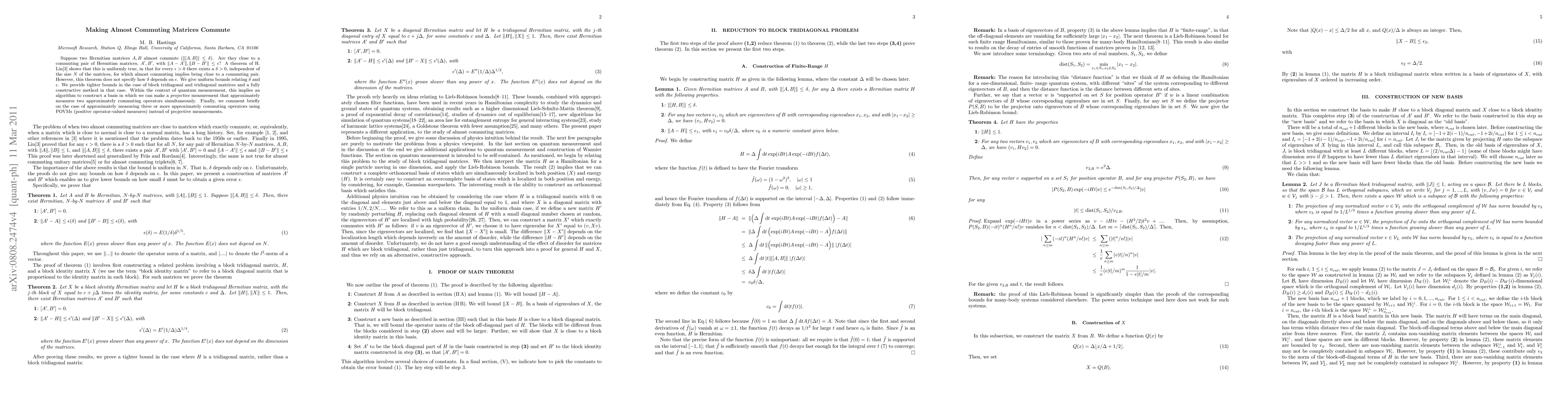 Suppose two Hermitian matrices $A,B$ almost commute ($\Vert [A,B] \Vert \leq \delta$). Are they close to a commuting pair of Hermitian matrices, $A',B'$, with $\Vert A-A' \Vert,\Vert B-B'\Vert \leq \epsilon$? A theorem of H. Lin shows that this is uniformly true, in that for every $\epsilon>0$ there exists a $\delta>0$, independent of the size $N$ of the matrices, for which almost commuting implies being close to a commuting pair. However, this theorem does not specify how $\delta$ depends on $\epsilon$. We give uniform bounds relating $\delta$ and $\epsilon$. We provide tighter bounds in the case of block tridiagonal and tridiagonal matrices and a fully constructive method in that case. Within the context of quantum measurement, this implies an algorithm to construct a basis in which we can make a {\it projective} measurement that approximately measures two approximately commuting operators simultaneously. Finally, we comment briefly on the case of approximately measuring three or more approximately commuting operators using POVMs (positive operator-valued measures) instead of projective measurements.