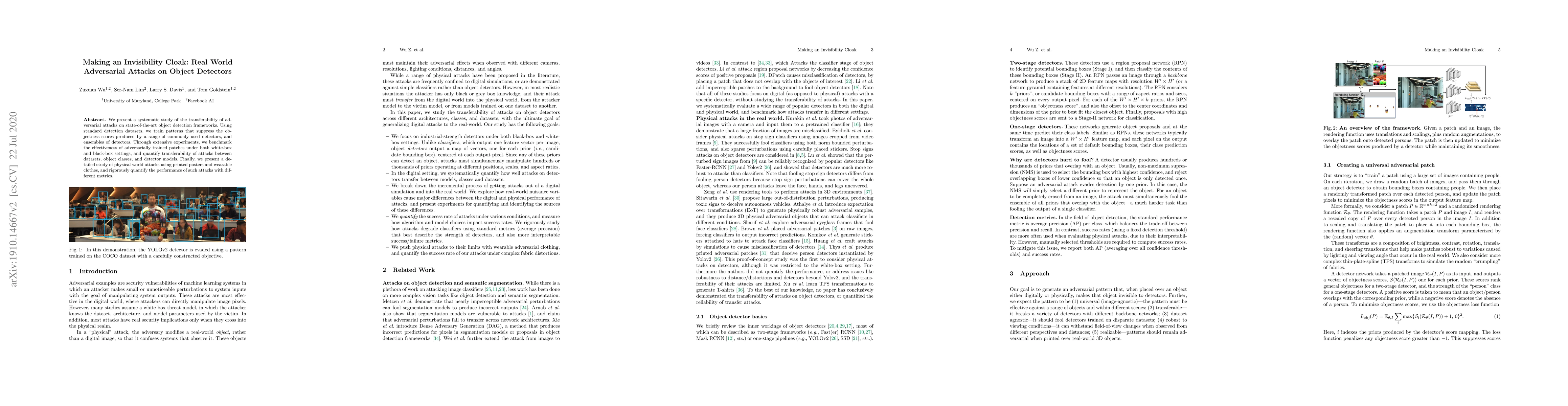 This paper systematically investigates adversarial attacks on object detectors, training patterns to suppress detection scores and evaluating their effectiveness across various settings. It also explores the transferability of these attacks and demonstrates practical physical world attacks using printed posters and wearable clothing.