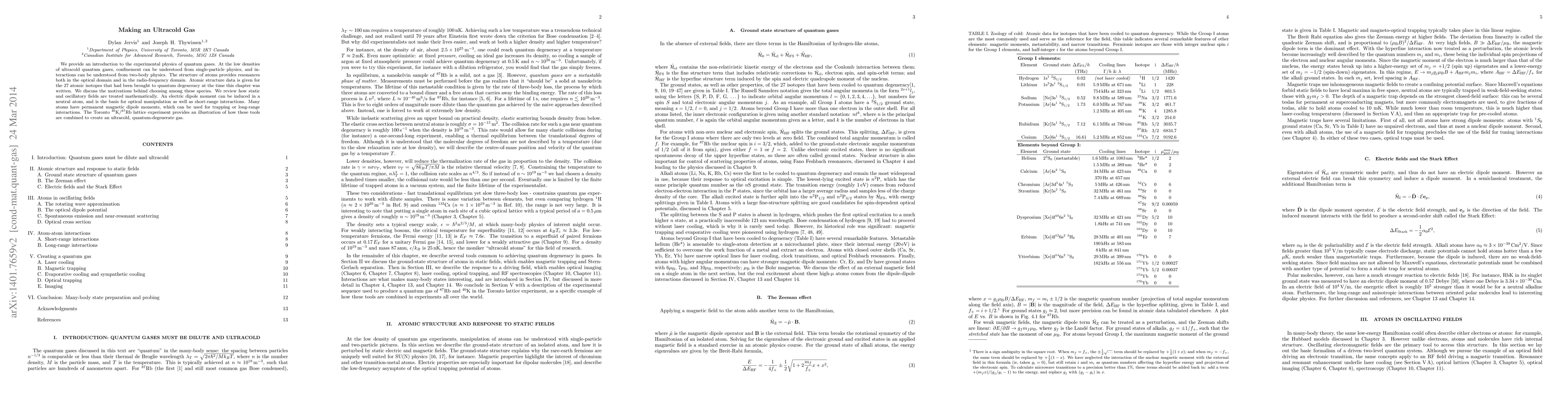 We provide an introduction to the experimental physics of quantum gases. At the low densities of ultracold quantum gases, confinement can be understood from single-particle physics, and interactions can be understood from two-body physics. The structure of atoms provides resonances both in the optical domain and in the radio-frequency domain. Atomic structure data is given for the 27 atomic isotopes that had been brought to quantum degeneracy at the time this chapter was written. We discuss the motivations behind choosing among these species. We review how static and oscillatory fields are treated mathematically. An electric dipole moment can be induced in a neutral atom, and is the basis for optical manipulation as well as short-range interactions. Many atoms have permanent magnetic dipole moments, which can be used for trapping or long-range interactions. The Toronto $^{40}$K/$^{87}$Rb lattice experiment provides an illustration of how these tools are combined to create an ultracold, quantum-degenerate gas.