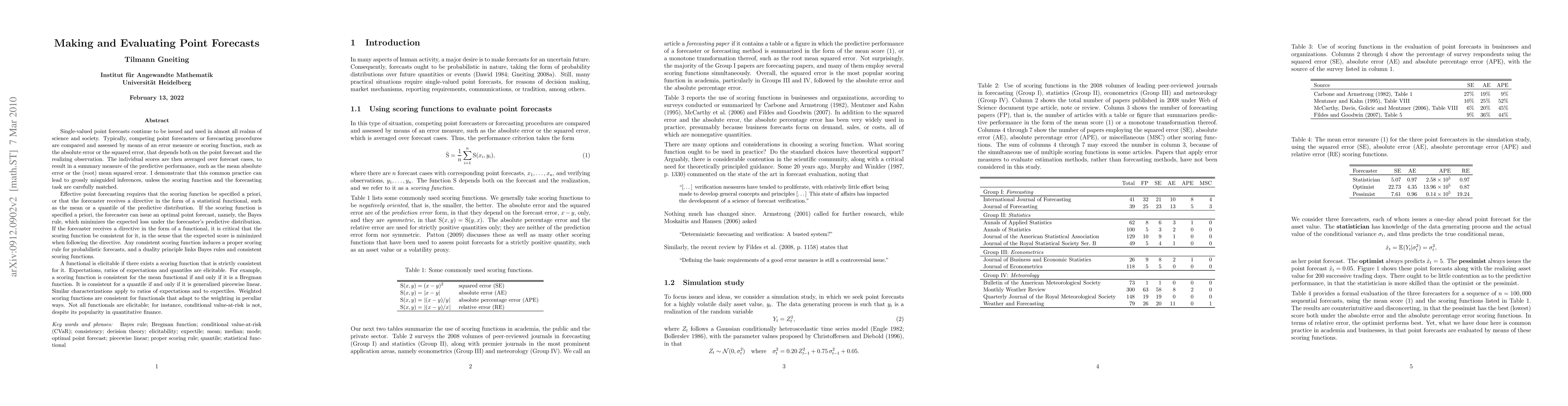 This paper highlights the importance of matching scoring functions and forecasting tasks for accurate point forecasting. It introduces the concept of elicitability, where a functional (like mean or quantile) is elicitable if a strictly consistent scoring function exists. The paper emphasizes that not all functionals are elicitable, with conditional value-at-risk being a notable example. It concludes that forecaster directives in the form of statistical functionals, guided by appropriate scoring functions, are crucial for effective point forecasting.