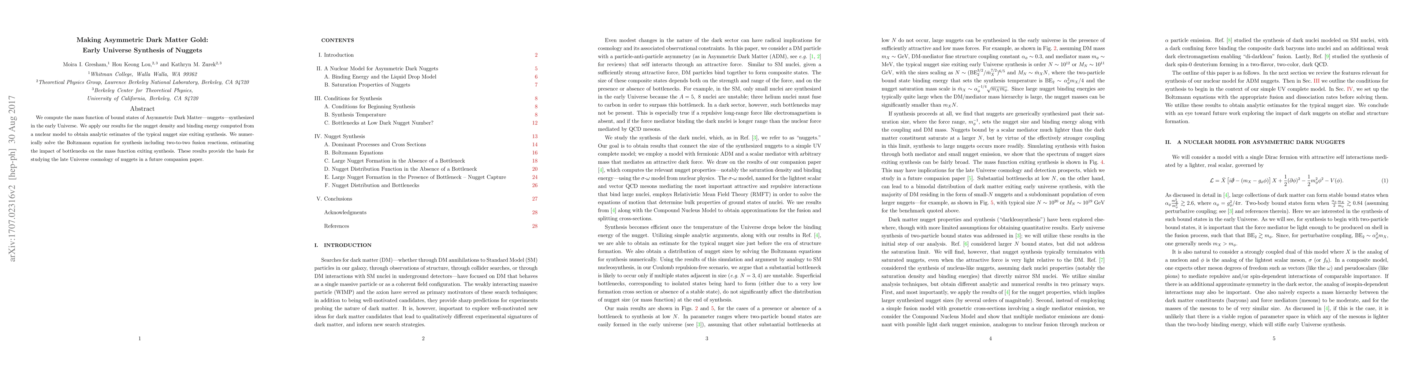We compute the mass function of bound states of Asymmetric Dark Matter--nuggets--synthesized in the early Universe. We apply our results for the nugget density and binding energy computed from a nuclear model to obtain analytic estimates of the typical nugget size exiting synthesis. We numerically solve the Boltzmann equation for synthesis including two-to-two fusion reactions, estimating the impact of bottlenecks on the mass function exiting synthesis. These results provide the basis for studying the late Universe cosmology of nuggets in a future companion paper.