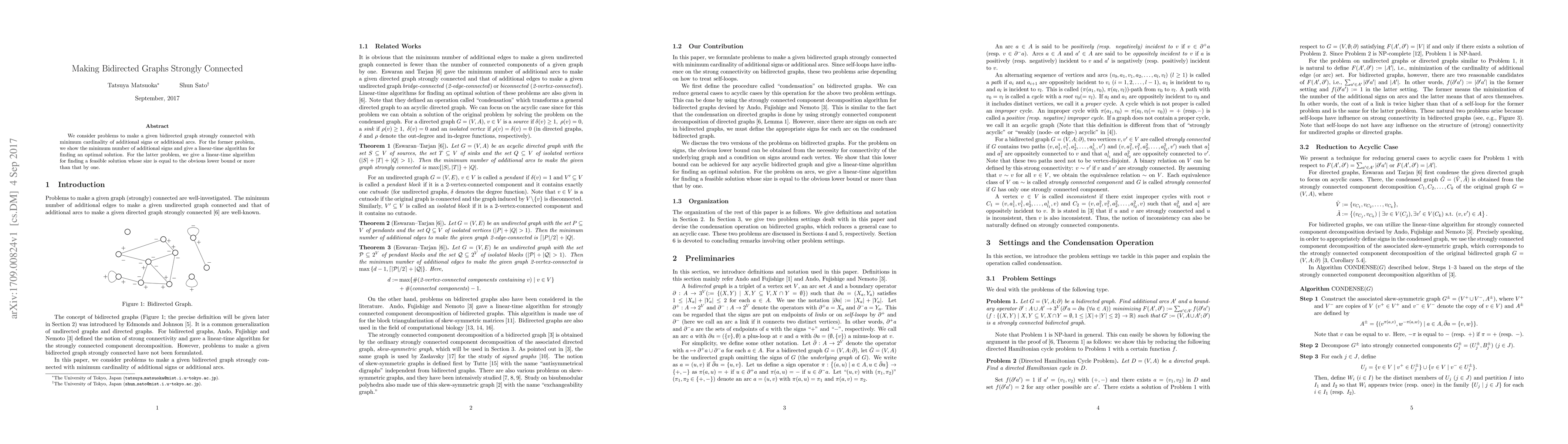 We consider problems to make a given bidirected graph strongly connected with minimum cardinality of additional signs or additional arcs. For the former problem, we show the minimum number of additional signs and give a linear-time algorithm for finding an optimal solution. For the latter problem, we give a linear-time algorithm for finding a feasible solution whose size is equal to the obvious lower bound or more than that by one.
