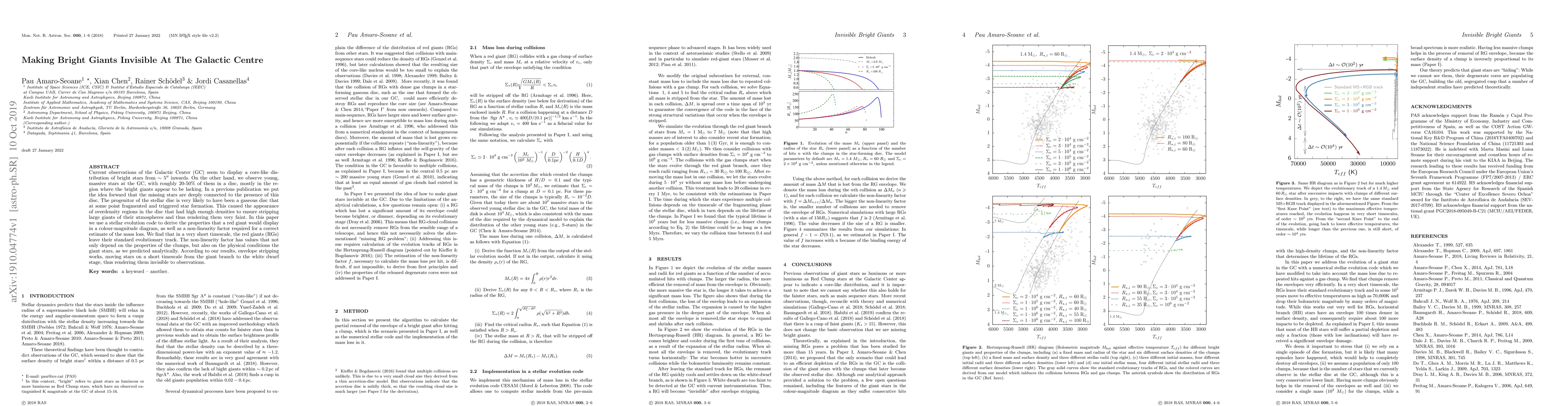Current observations of the Galactic Center (GC) seem to display a core-like distribution of bright stars from $\sim 5"$ inwards. On the other hand, we observe young, massive stars at the GC, with roughly 20-50\% of them in a disc, mostly in the region where the bright giants appear to be lacking. In a previous publication we put the idea forward that the missing stars are deeply connected to the presence of this disc. The progenitor of the stellar disc is very likely to have been a gaseous disc that at some point fragmented and triggered star formation. This caused the appearance of overdensity regions in the disc that had high enough densities to ensure stripping large giants of their atmospheres and thus rendering them very faint. In this paper we use a stellar evolution code to derive the properties that a red giant would display in a colour-magnitude diagram, as well as a non-linearity factor required for a correct estimate of the mass loss. We find that in a very short timescale, the red giants (RGs) leave their standard evolutionary track. The non-linearity factor has values that not only depend on the properties of the clumps, but also on the physical conditions the giant stars, as we predicted analytically. According to our results, envelope stripping works, moving stars on a short timescale from the giant branch to the white dwarf stage, thus rendering them invisible to observations.