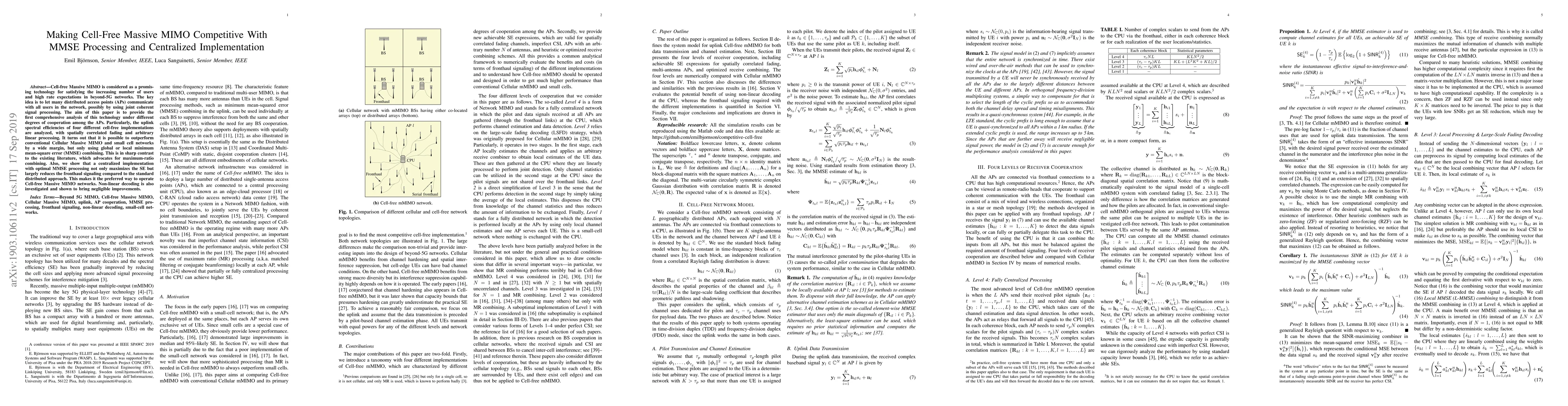 This paper analyzes cell-free Massive MIMO under various cooperation levels among distributed access points, demonstrating that global or local MMSE combining can significantly outperform conventional cellular systems. A centralized implementation with optimal MMSE processing maximizes spectral efficiency while reducing fronthaul signaling compared to distributed methods.