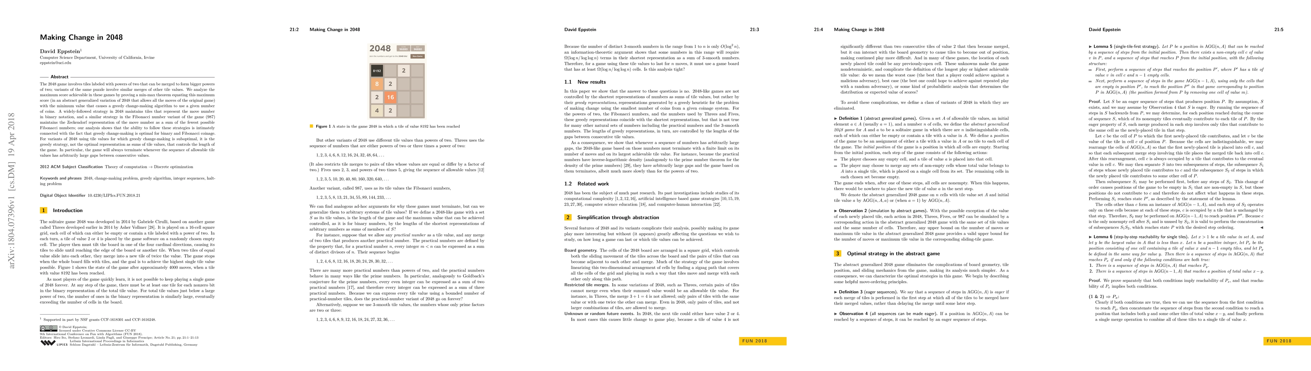 This paper analyzes the maximum score achievable in the 2048 game and its variants, proving a min-max theorem linking the highest score to a greedy change-making algorithm. It shows that optimal strategies in binary and Fibonacci versions of the game are tied to the optimality of greedy change-making for these systems, while suboptimal change-making leads to game termination with large gaps in tile values.