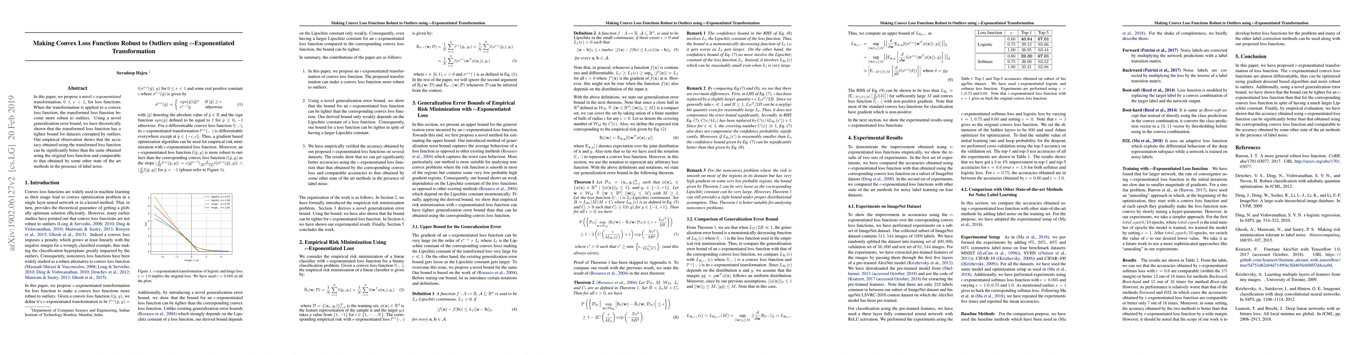 This paper proposes an $e$-exponentiated transformation for convex loss functions to enhance their robustness against outliers. The transformed loss function is shown to have tighter generalization error bounds and empirically achieves better accuracy than the original loss function, comparable to state-of-the-art methods in noisy datasets.