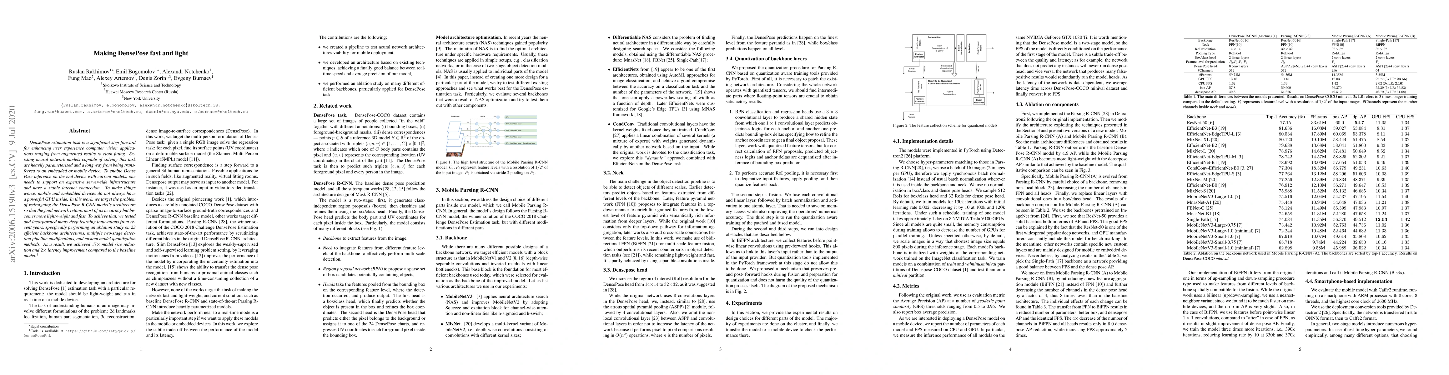 DensePose estimation task is a significant step forward for enhancing user experience computer vision applications ranging from augmented reality to cloth fitting. Existing neural network models capable of solving this task are heavily parameterized and a long way from being transferred to an embedded or mobile device. To enable Dense Pose inference on the end device with current models, one needs to support an expensive server-side infrastructure and have a stable internet connection. To make things worse, mobile and embedded devices do not always have a powerful GPU inside. In this work, we target the problem of redesigning the DensePose R-CNN model's architecture so that the final network retains most of its accuracy but becomes more light-weight and fast. To achieve that, we tested and incorporated many deep learning innovations from recent years, specifically performing an ablation study on 23 efficient backbone architectures, multiple two-stage detection pipeline modifications, and custom model quantization methods. As a result, we achieved $17\times$ model size reduction and $2\times$ latency improvement compared to the baseline model.