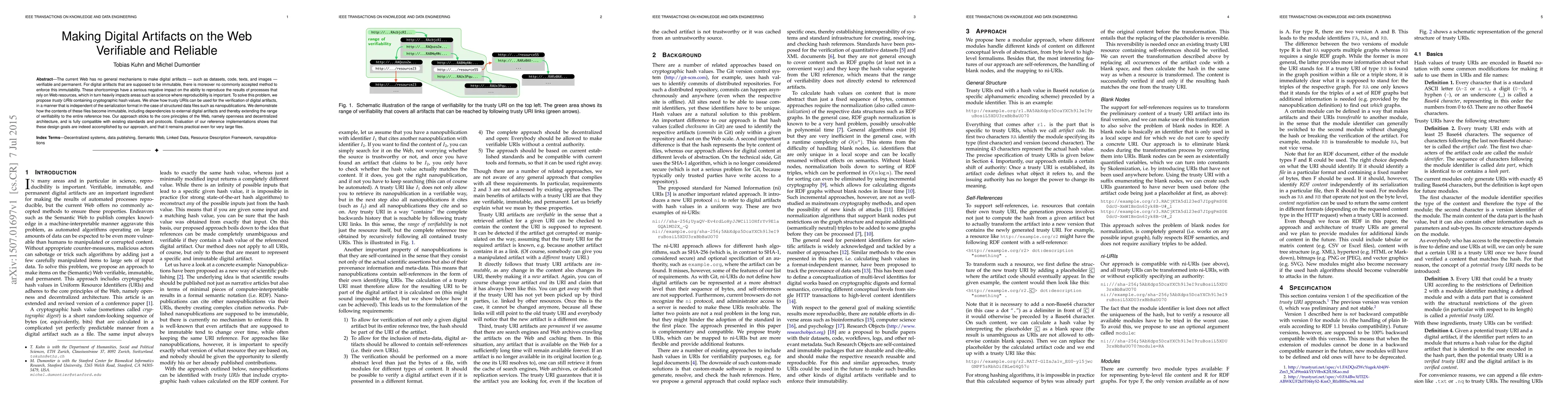 The current Web has no general mechanisms to make digital artifacts --- such as datasets, code, texts, and images --- verifiable and permanent. For digital artifacts that are supposed to be immutable, there is moreover no commonly accepted method to enforce this immutability. These shortcomings have a serious negative impact on the ability to reproduce the results of processes that rely on Web resources, which in turn heavily impacts areas such as science where reproducibility is important. To solve this problem, we propose trusty URIs containing cryptographic hash values. We show how trusty URIs can be used for the verification of digital artifacts, in a manner that is independent of the serialization format in the case of structured data files such as nanopublications. We demonstrate how the contents of these files become immutable, including dependencies to external digital artifacts and thereby extending the range of verifiability to the entire reference tree. Our approach sticks to the core principles of the Web, namely openness and decentralized architecture, and is fully compatible with existing standards and protocols. Evaluation of our reference implementations shows that these design goals are indeed accomplished by our approach, and that it remains practical even for very large files.