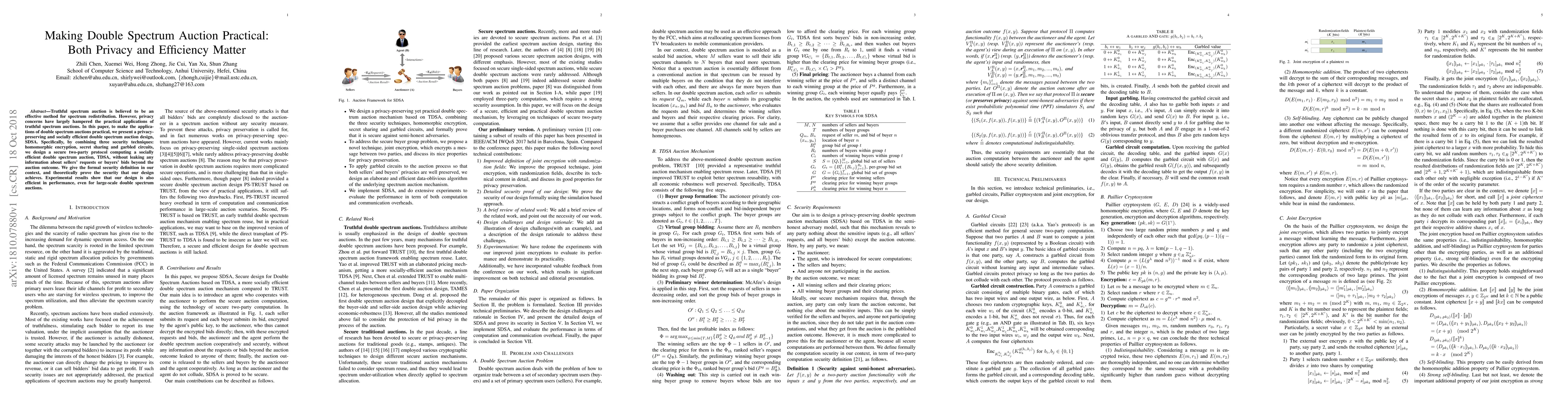 This paper proposes a privacy-preserving and socially efficient double spectrum auction design, SDSA, using homomorphic encryption, secret sharing, and garbled circuits to ensure no private information is leaked. The design achieves theoretical security and demonstrates efficiency in large-scale auctions.