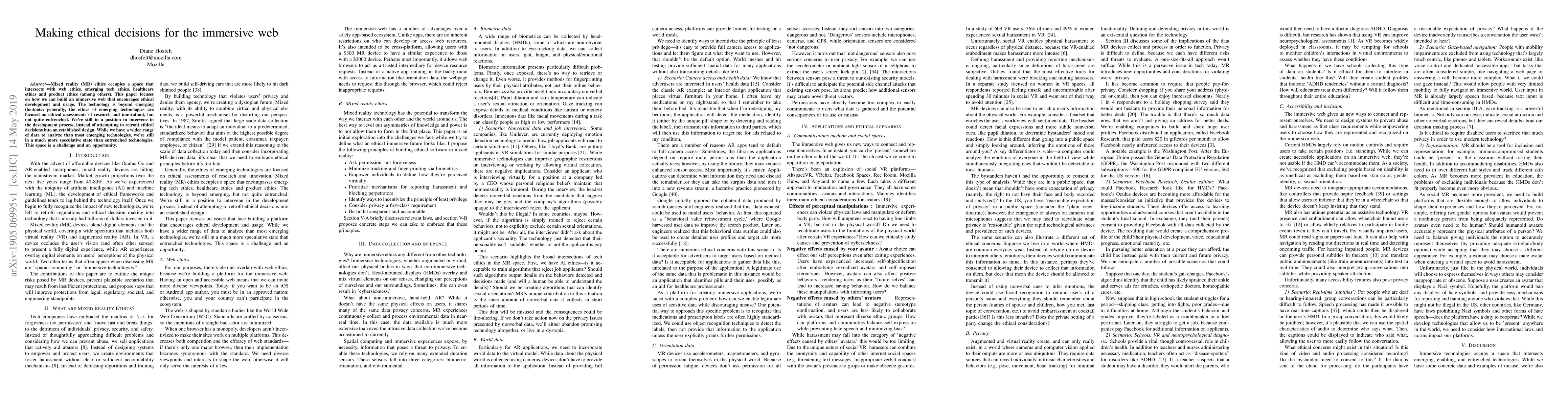 Mixed reality (MR) ethics occupies a space that intersects with web ethics, emerging tech ethics, healthcare ethics and product ethics (among others). This paper focuses on how we can build an immersive web that encourages ethical development and usage. The technology is beyond emerging (footnote: generally, the ethics of emerging technologies are focused on ethical assessments of research and innovation), but not quite entrenched. We're still in a position to intervene in the development process, instead of attempting to retrofit ethical decisions into an established design. While we have a wider range of data to analyze than most emerging technologies, we're still in a much more speculative state than entrenched technologies. This space is a challenge and an opportunity.