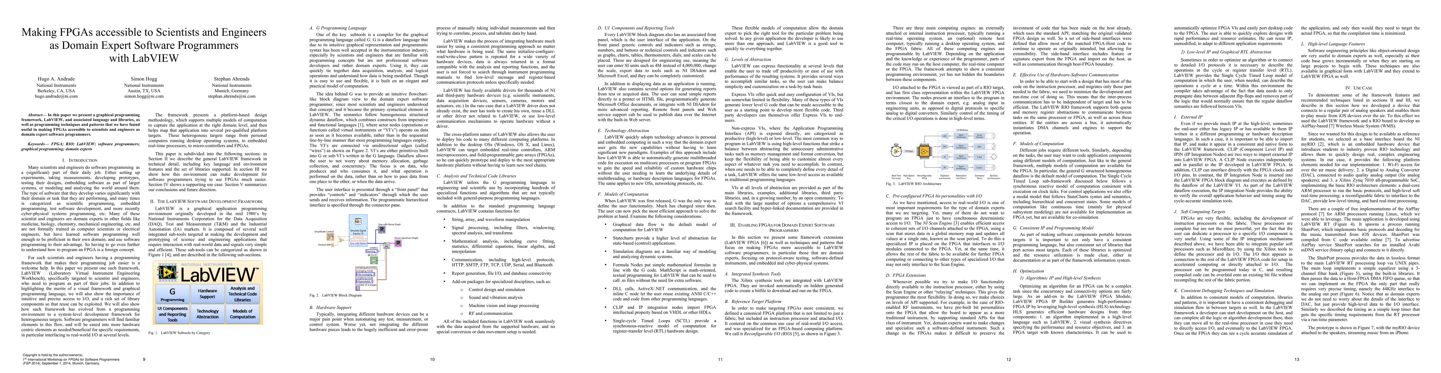 Summary: This paper introduces LabVIEW as a graphical programming framework to simplify FPGA programming for scientists and engineers, offering useful techniques and libraries to make FPGAs accessible to domain experts.