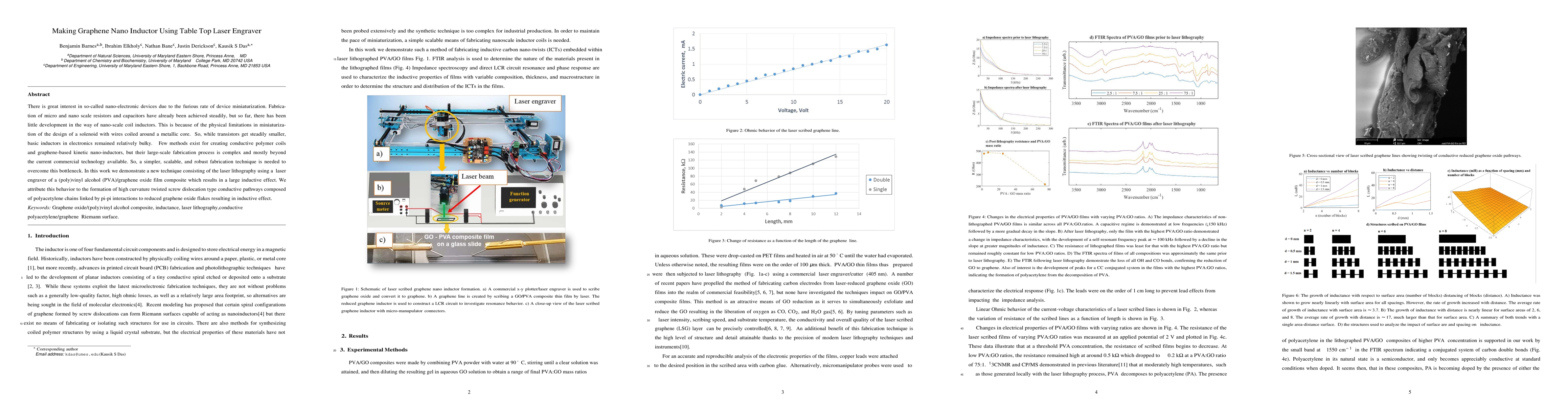 This paper presents a novel method for fabricating graphene nano-inductors using a tabletop laser engraver to etch a PVA/graphene oxide composite film. The technique results in high-curvature conductive pathways that produce a significant inductive effect, addressing the challenge of creating scalable, simple, and robust nano-scale inductors.