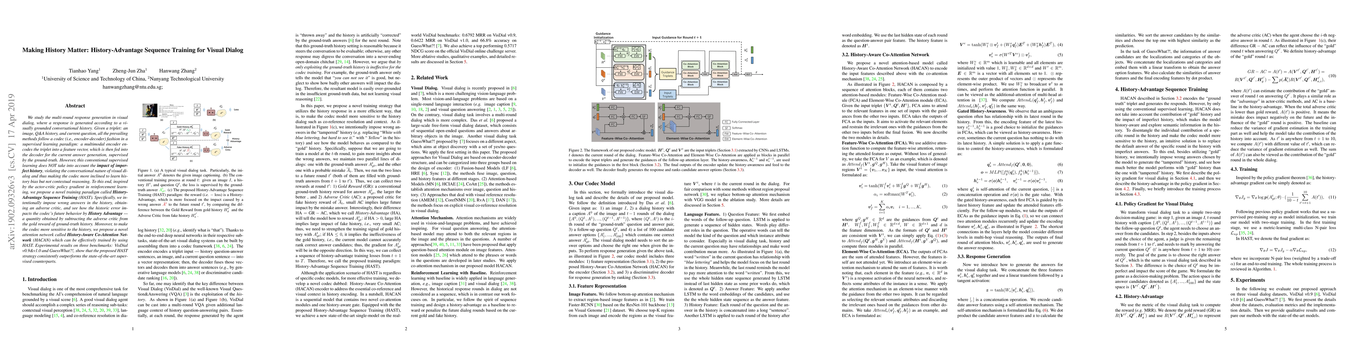 We study the multi-round response generation in visual dialog, where a response is generated according to a visually grounded conversational history. Given a triplet: an image, Q&A history, and current question, all the prevailing methods follow a codec (i.e., encoder-decoder) fashion in a supervised learning paradigm: a multimodal encoder encodes the triplet into a feature vector, which is then fed into the decoder for the current answer generation, supervised by the ground-truth. However, this conventional supervised learning does NOT take into account the impact of imperfect history, violating the conversational nature of visual dialog and thus making the codec more inclined to learn history bias but not contextual reasoning. To this end, inspired by the actor-critic policy gradient in reinforcement learning, we propose a novel training paradigm called History Advantage Sequence Training (HAST). Specifically, we intentionally impose wrong answers in the history, obtaining an adverse critic, and see how the historic error impacts the codec's future behavior by History Advantage-a quantity obtained by subtracting the adverse critic from the gold reward of ground-truth history. Moreover, to make the codec more sensitive to the history, we propose a novel attention network called History-Aware Co-Attention Network (HACAN) which can be effectively trained by using HAST. Experimental results on three benchmarks: VisDial v0.9&v1.0 and GuessWhat?!, show that the proposed HAST strategy consistently outperforms the state-of-the-art supervised counterparts.