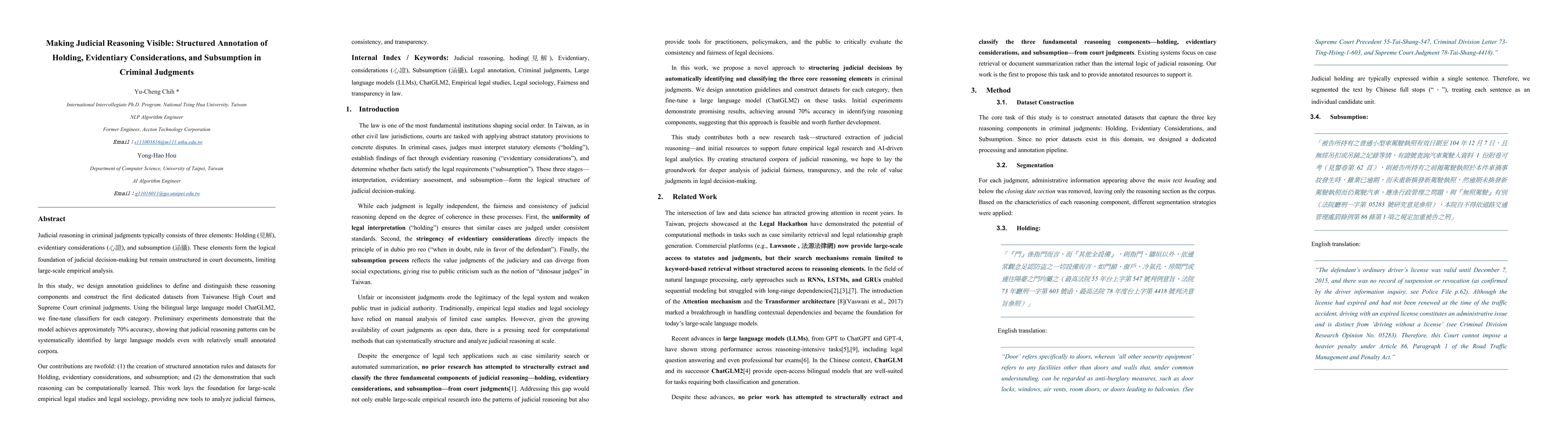 The study introduced structured annotation rules and created the first dedicated datasets for analyzing judicial reasoning components in Taiwanese criminal judgments, enabling computational learning of legal reasoning patterns.