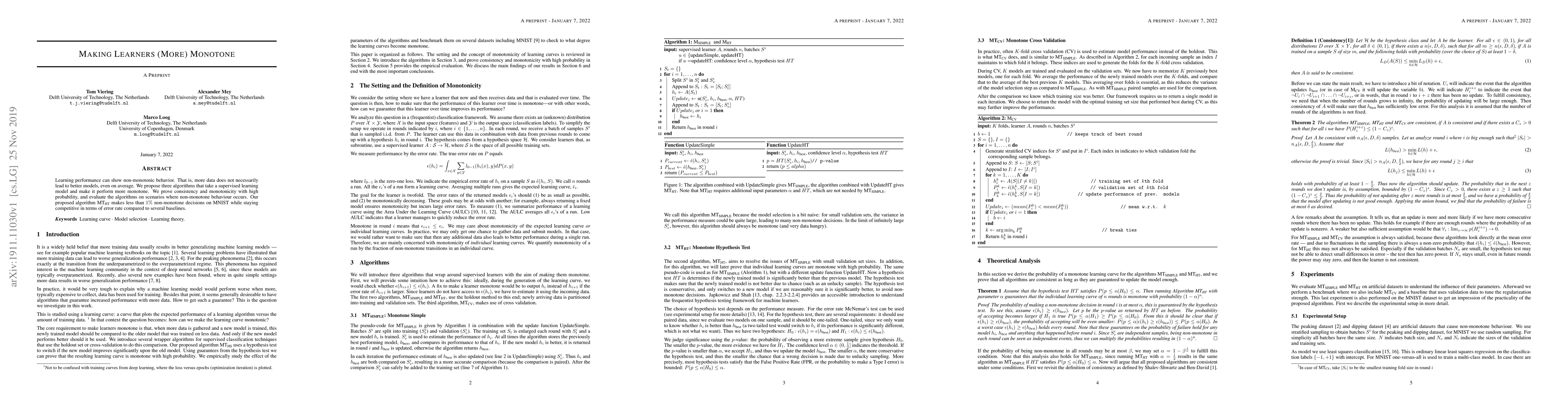Learning performance can show non-monotonic behavior. That is, more data does not necessarily lead to better models, even on average. We propose three algorithms that take a supervised learning model and make it perform more monotone. We prove consistency and monotonicity with high probability, and evaluate the algorithms on scenarios where non-monotone behaviour occurs. Our proposed algorithm $\text{MT}_{\text{HT}}$ makes less than $1\%$ non-monotone decisions on MNIST while staying competitive in terms of error rate compared to several baselines.