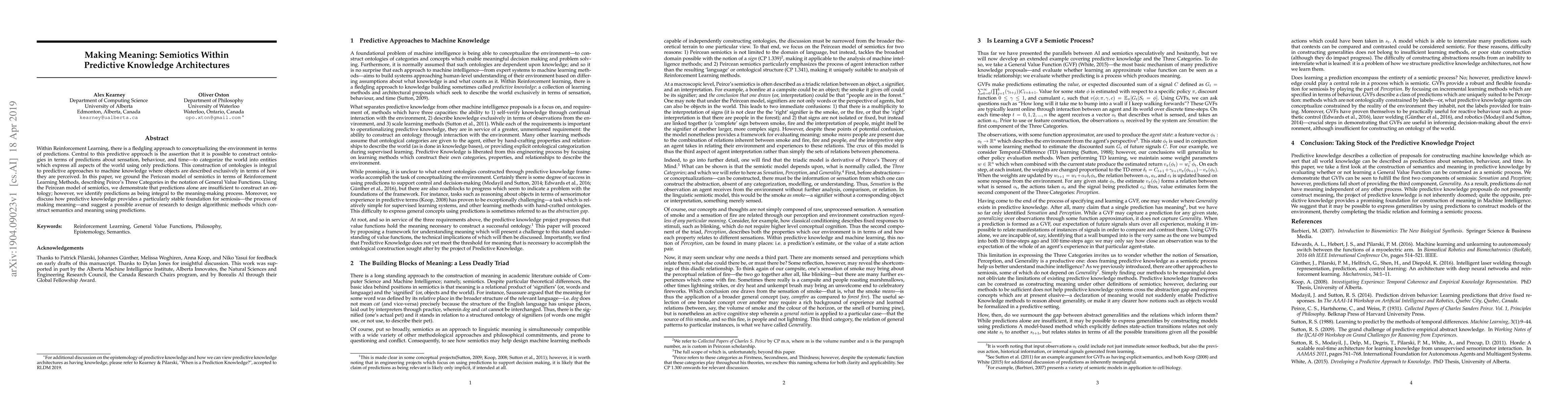 Within Reinforcement Learning, there is a fledgling approach to conceptualizing the environment in terms of predictions. Central to this predictive approach is the assertion that it is possible to construct ontologies in terms of predictions about sensation, behaviour, and time---to categorize the world into entities which express all aspects of the world using only predictions. This construction of ontologies is integral to predictive approaches to machine knowledge where objects are described exclusively in terms of how they are perceived. In this paper, we ground the Pericean model of semiotics in terms of Reinforcement Learning Methods, describing Peirce's Three Categories in the notation of General Value Functions. Using the Peircean model of semiotics, we demonstrate that predictions alone are insufficient to construct an ontology; however, we identify predictions as being integral to the meaning-making process. Moreover, we discuss how predictive knowledge provides a particularly stable foundation for semiosis\textemdash the process of making meaning\textemdash and suggest a possible avenue of research to design algorithmic methods which construct semantics and meaning using predictions.