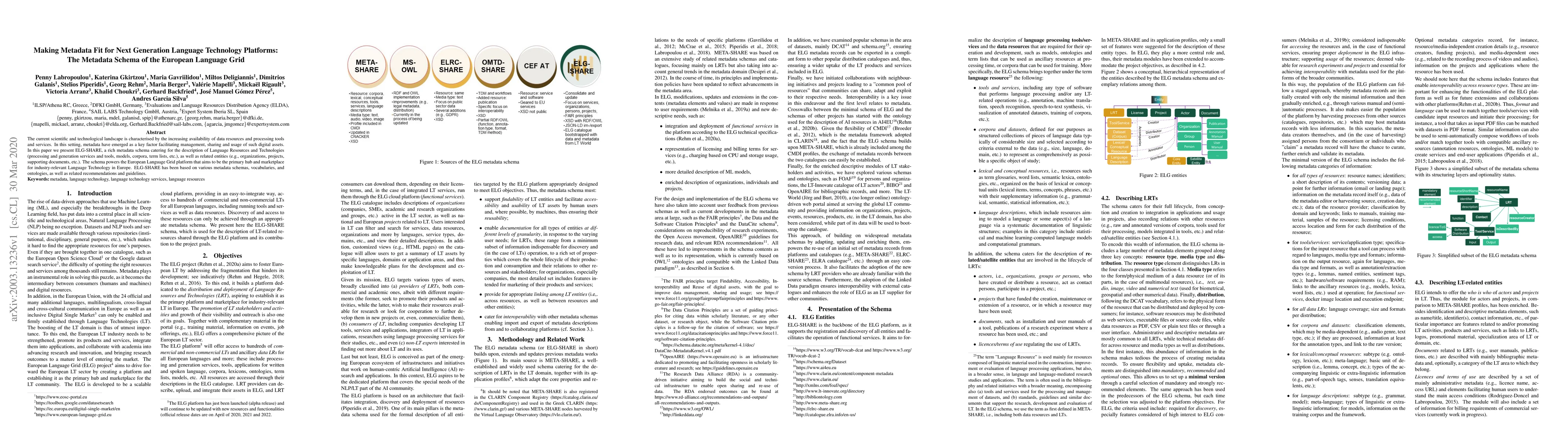 The current scientific and technological landscape is characterised by the increasing availability of data resources and processing tools and services. In this setting, metadata have emerged as a key factor facilitating management, sharing and usage of such digital assets. In this paper we present ELG-SHARE, a rich metadata schema catering for the description of Language Resources and Technologies (processing and generation services and tools, models, corpora, term lists, etc.), as well as related entities (e.g., organizations, projects, supporting documents, etc.). The schema powers the European Language Grid platform that aims to be the primary hub and marketplace for industry-relevant Language Technology in Europe. ELG-SHARE has been based on various metadata schemas, vocabularies, and ontologies, as well as related recommendations and guidelines.