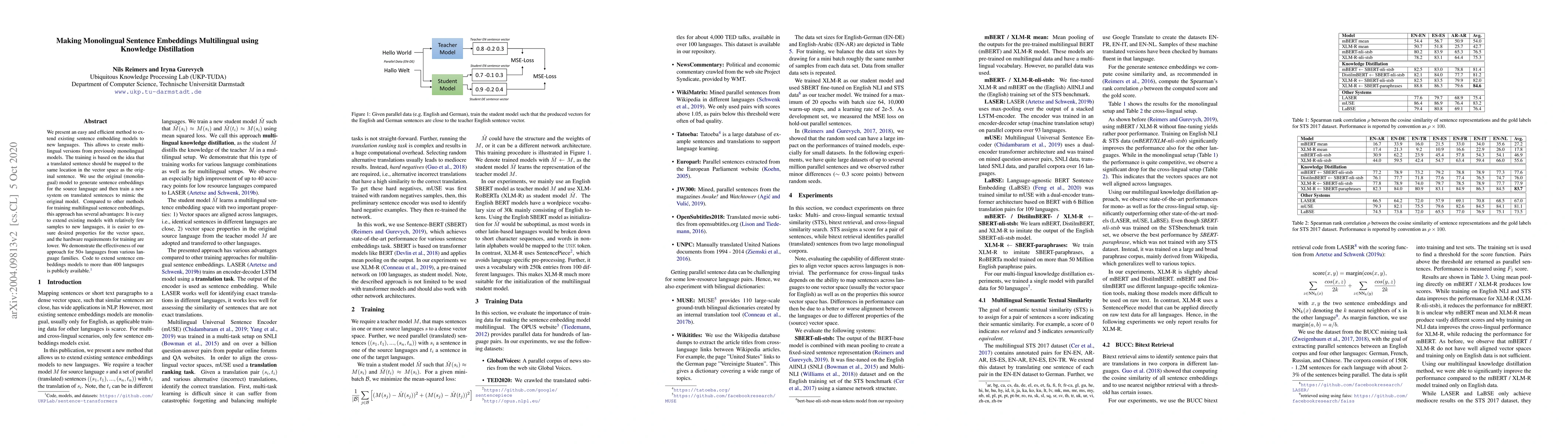 This paper proposes an efficient method for extending monolingual sentence embedding models to multilingual versions using knowledge distillation. The approach leverages existing models to generate embeddings for source language sentences and trains new systems on translated sentences to mimic the original model, demonstrating effectiveness across 50+ languages.