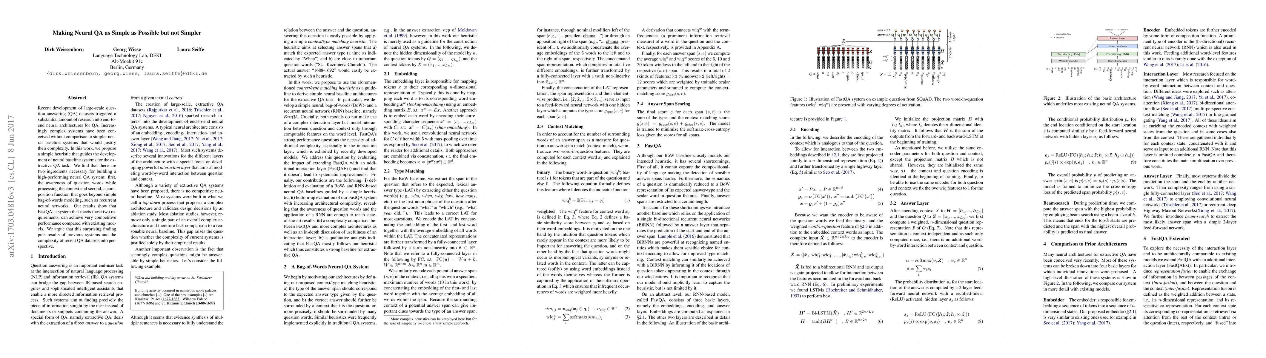 This paper proposes a simple heuristic for developing neural baseline systems for extractive question answering, emphasizing the importance of question word awareness and advanced composition functions. The FastQA system, which incorporates these elements, achieves competitive performance against more complex models, suggesting that previous results may have overemphasized system complexity.
