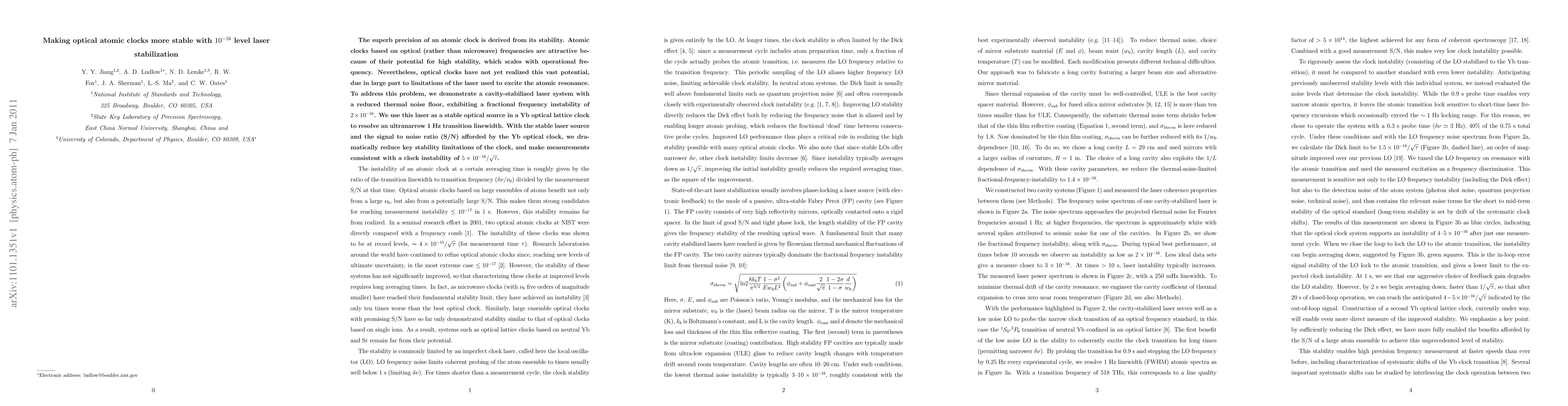 The superb precision of an atomic clock is derived from its stability. Atomic clocks based on optical (rather than microwave) frequencies are attractive because of their potential for high stability, which scales with operational frequency. Nevertheless, optical clocks have not yet realized this vast potential, due in large part to limitations of the laser used to excite the atomic resonance. To address this problem, we demonstrate a cavity-stabilized laser system with a reduced thermal noise floor, exhibiting a fractional frequency instability of $2 \times 10^{-16}$. We use this laser as a stable optical source in a Yb optical lattice clock to resolve an ultranarrow 1 Hz transition linewidth. With the stable laser source and the signal to noise ratio (S/N) afforded by the Yb optical clock, we dramatically reduce key stability limitations of the clock, and make measurements consistent with a clock instability of $5 \times 10^{-16} / \sqrt{\tau}$.