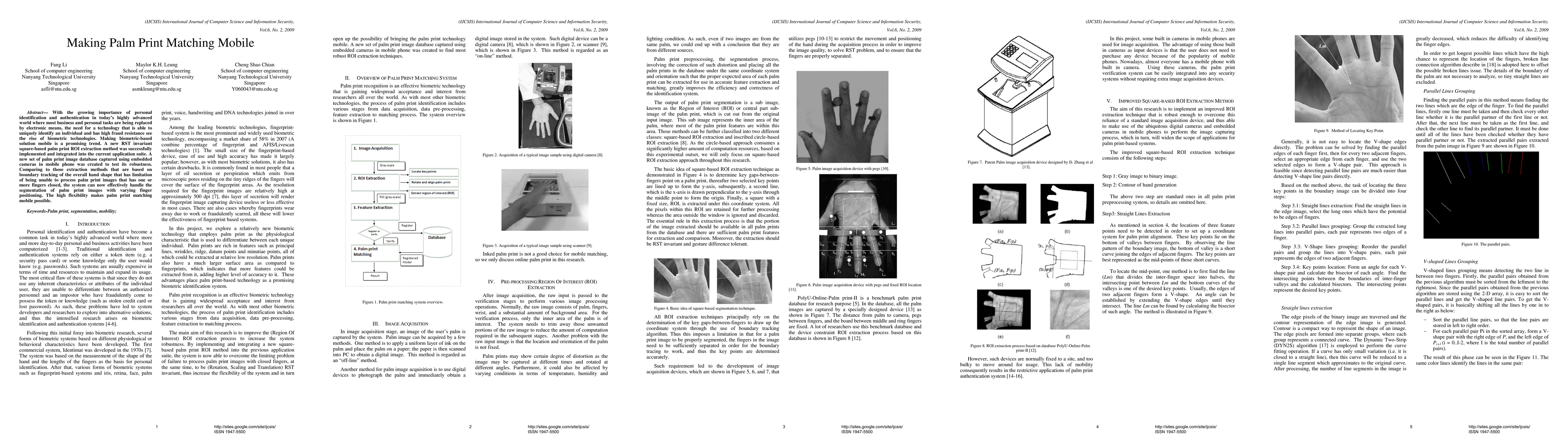 With the growing importance of personal identification and authentication in todays highly advanced world where most business and personal tasks are being replaced by electronic means, the need for a technology that is able to uniquely identify an individual and has high fraud resistance see the rise of biometric technologies. Making biometric based solution mobile is a promising trend. A new RST invariant square based palm print ROI extraction method was successfully implemented and integrated into the current application suite. A new set of palm print image database captured using embedded cameras in mobile phone was created to test its robustness. Comparing to those extraction methods that are based on boundary tracking of the overall hand shape that has limitation of being unable to process palm print images that has one or more fingers closed, the system can now effectively handle the segmentation of palm print images with varying finger positioning. The high flexibility makes palm print matching mobile possible.