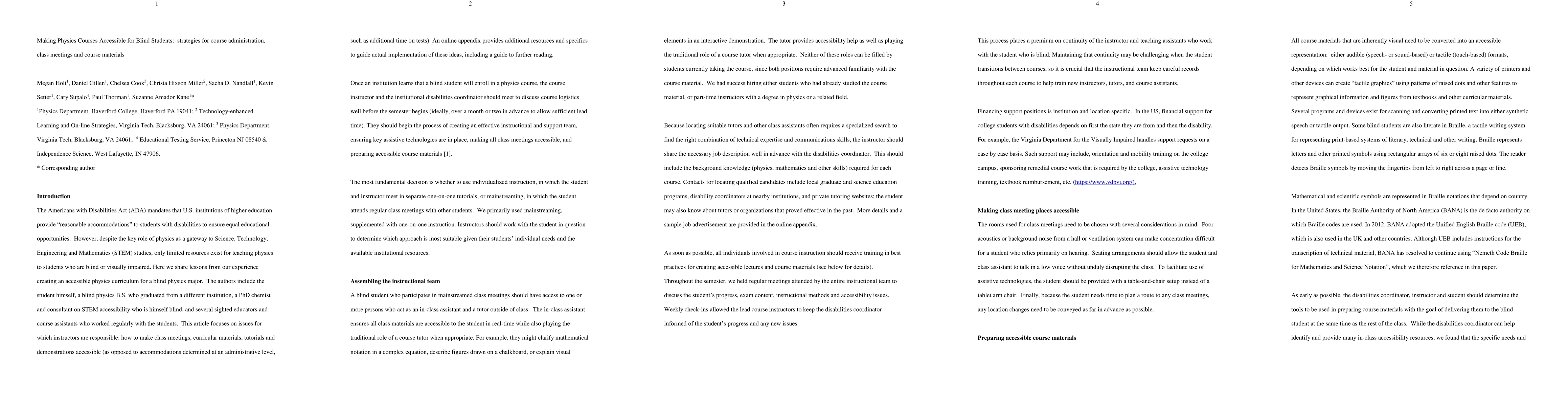 This paper details strategies for making physics courses accessible for blind students, including course administration, class meetings, and materials. The authors, including a blind physics graduate and educators, share lessons learned from creating an inclusive curriculum, emphasizing universal design principles that benefit all students.