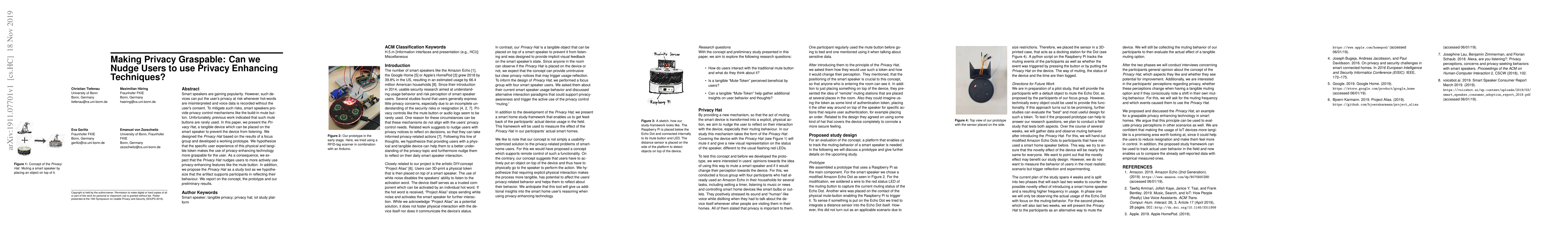 Smart speakers are gaining popularity. However, such devices can put the user's privacy at risk whenever hot-words are misinterpreted and voice data is recorded without the user's consent. To mitigate such risks, smart speakers provide privacy control mechanisms like the build-in mute button. Unfortunately, previous work indicated that such mute buttons are rarely used. In this paper, we present the Privacy Hat, a tangible device which can be placed on the smart speaker to prevent the device from listening. We designed the Privacy Hat based on the results of a focus group and developed a working prototype. We hypothesize that the specific user experience of this physical and tangible token makes the use of privacy-enhancing technology more graspable for the user. As a consequence, we expect that the Privacy Hat nudges users to more actively use privacy-enhancing features like the mute button. In addition, we propose the Privacy Hat as a study tool as we hypothesize that the artifact supports participants in reflecting their behaviour. We report on the concept, the prototype and our preliminary results.